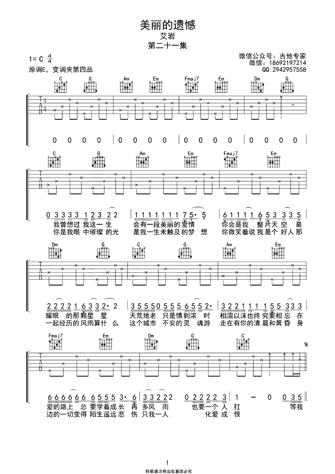 曲谱介绍: 《美丽的遗憾》吉他弹唱谱,原调是E调,选用C调指法,变调夹夹4品,可以弹唱原调,弹唱难度不大,在扫弦部分特别要注意节奏的掌握,就可以很好的上手了。