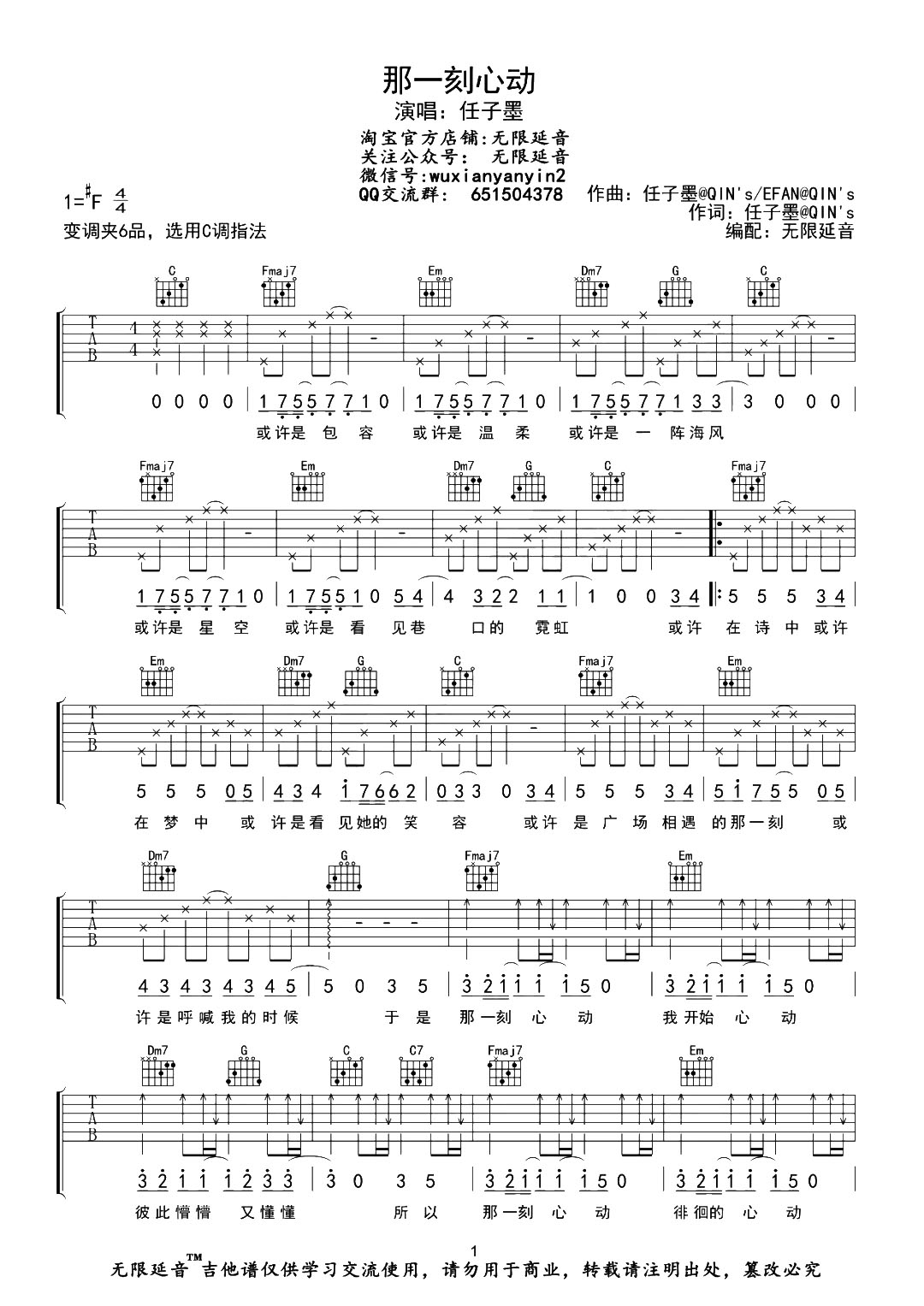 那一刻心动吉他谱 - 任子墨 - C调吉他弹唱谱