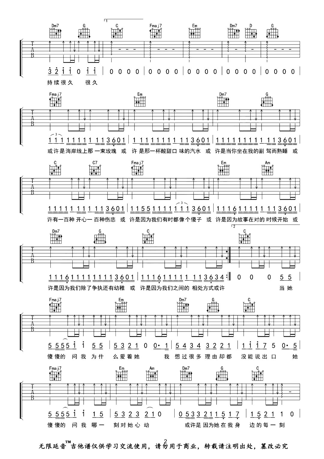 曲谱介绍: 《那一刻心动》吉他弹唱谱,总共2张高清图片谱,由无限延音编配制谱,原调#F,选用C调指法,变调夹夹6品才能弹唱原调,整体弹唱难度不大,感兴趣的朋友不妨试试哦。