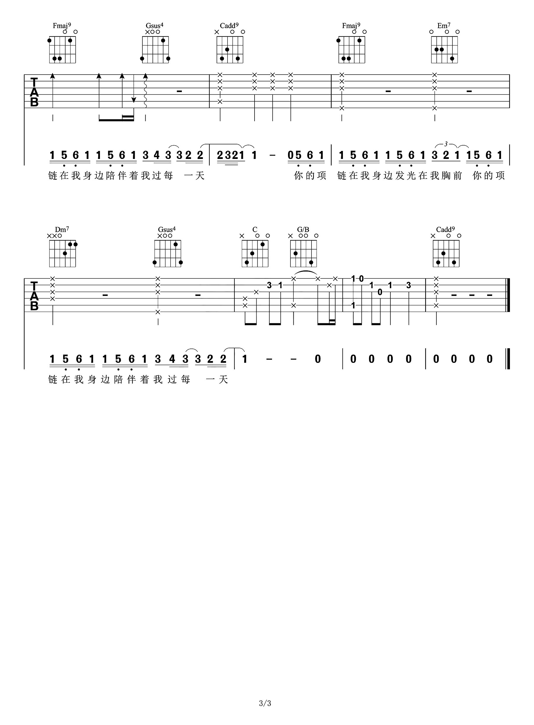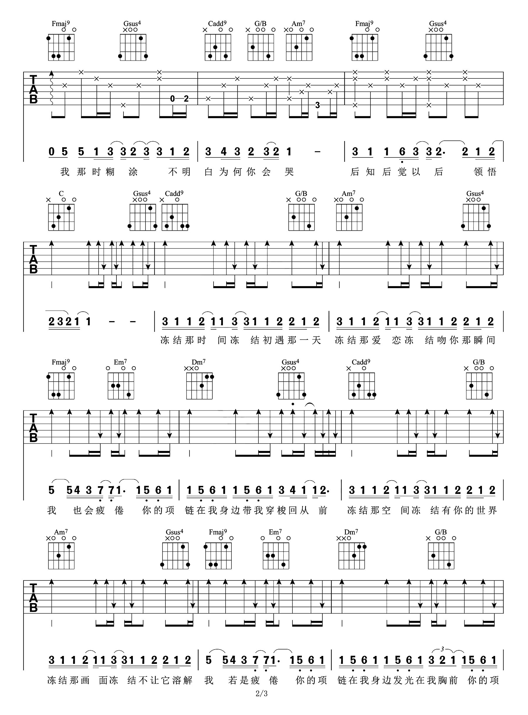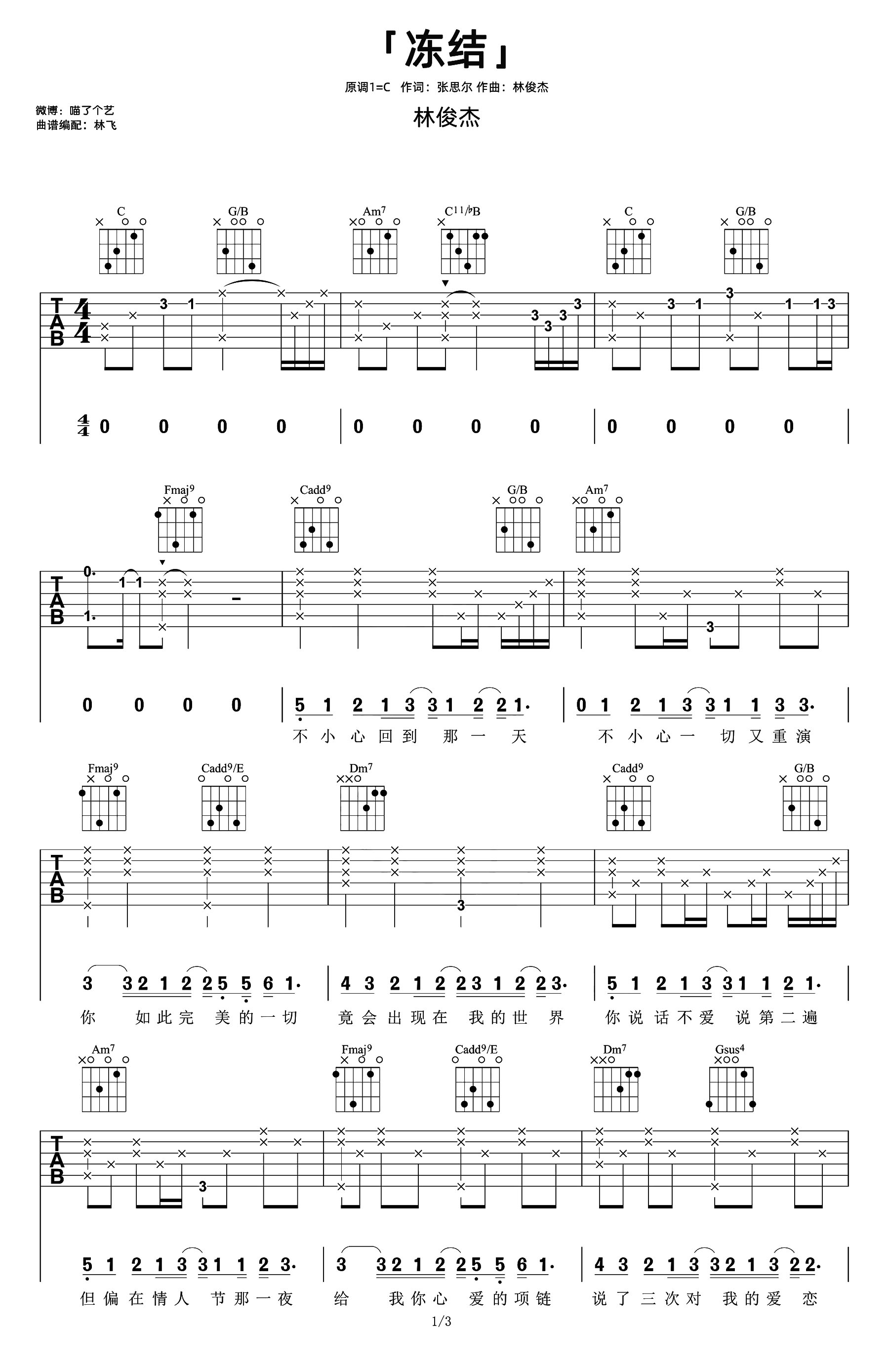 曲谱介绍: 林俊杰《冻结》吉他谱,由@喵了个艺编配制谱,总共3张高清图片谱,选用C调指法,弹唱难度不算太大,附上了女生版的演示视频,在曲谱下方可以找到,女生建议夹在3品弹唱,男生如果弹唱太高,可以不用变调夹或夹1品弹唱。 《冻结》吉他弹唱演示视频