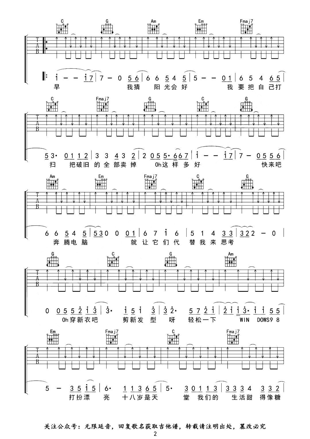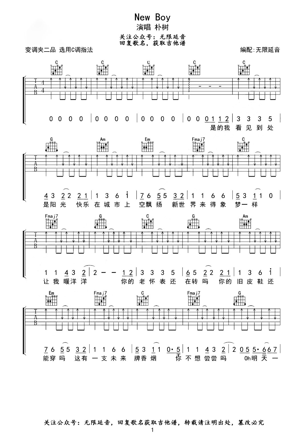 曲谱介绍: 曲谱由无限延音编配,总共2张高清图片谱,选用C调指法,变调夹夹2品弹唱原调,扫弦节奏请注意延音的熟练,请参考下方教学视频。 《New boy》吉他弹唱教学视频