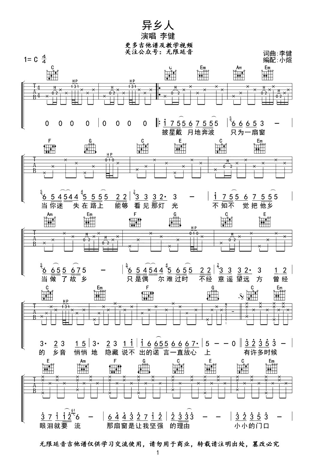 异乡人吉他谱 - 李健 - C调吉他弹唱谱 - 原版