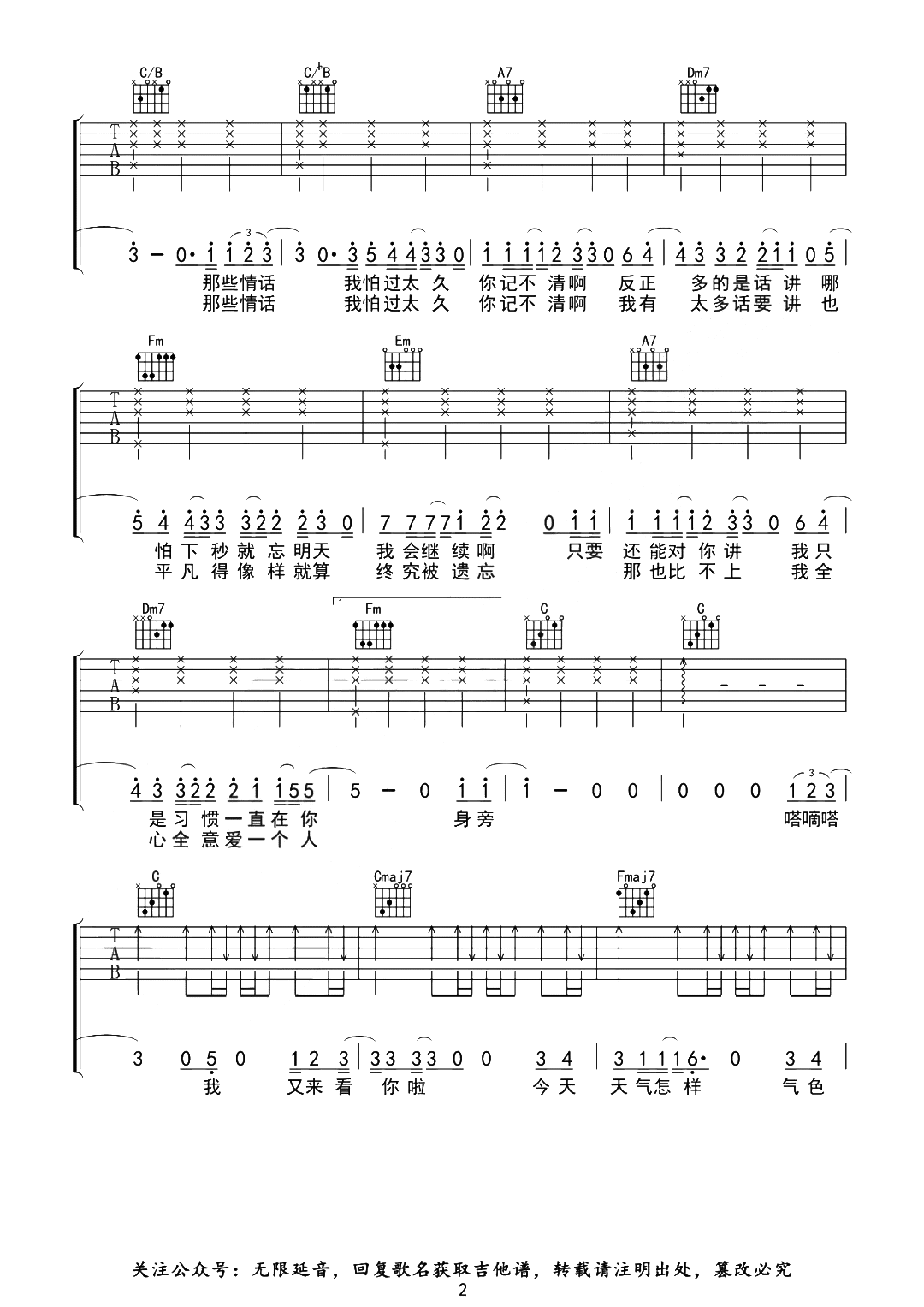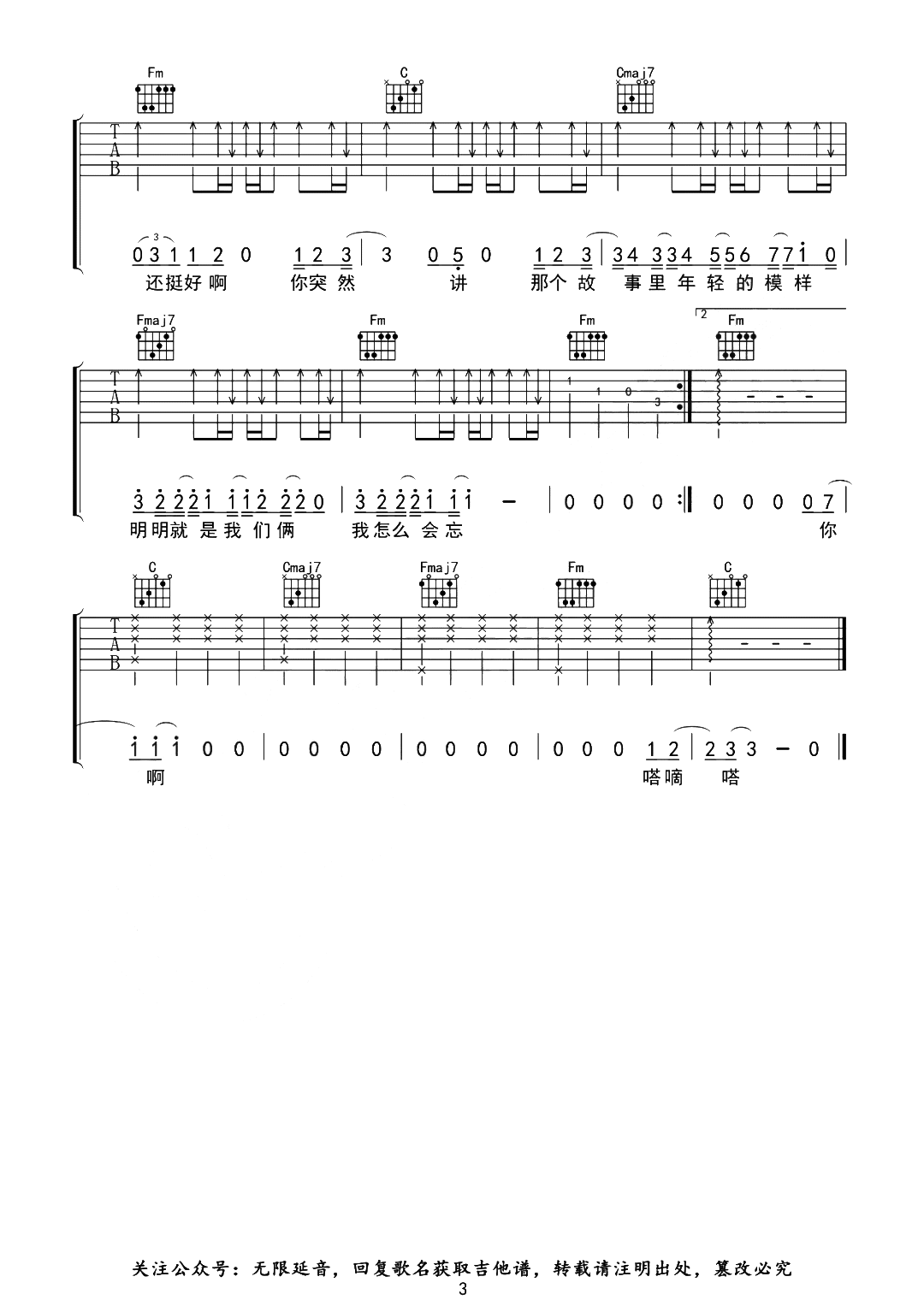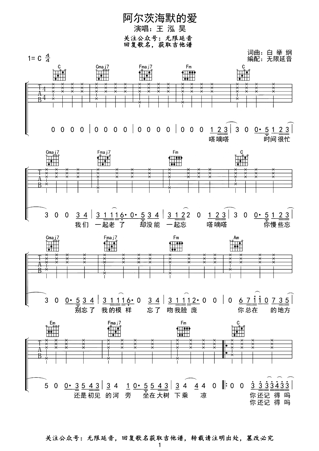 曲谱介绍: 《阿尔茨海默的爱》这首曲谱由无限延音编配制谱,选用C调指法,总共3张高清图片谱,弹唱难度不算大,比较好上手,感兴趣的朋友不要错过。