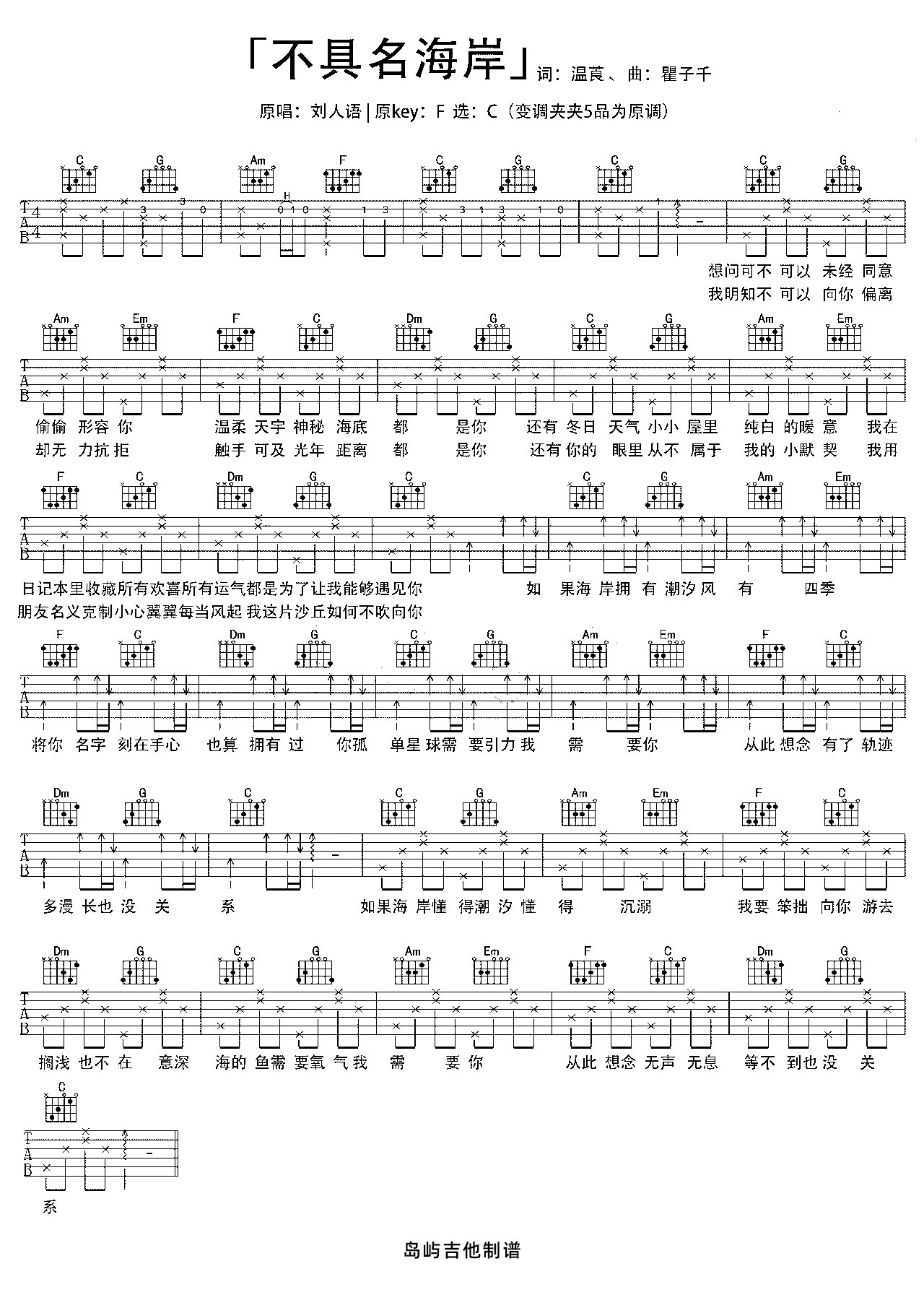 曲谱介绍: 这首曲谱总共1张高清图片谱,由岛屿吉他编配制谱,原调F,选用C调指法,变调夹推荐在5品弹唱原调,整体难度不大,适合初级水平以上弹唱,下方附有弹唱演示视频。 《不具名海岸》吉他弹唱演示视频