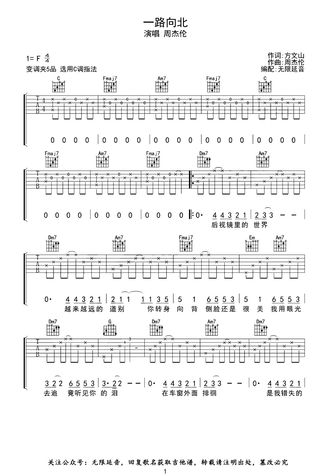 曲谱介绍: 《一路向北》这首吉他弹唱谱,原调是F调,选用C调指法,女生变调夹可以夹5-7品弹唱,演示视频为男生标准调音,不用变调夹。 《一路向北》吉他弹唱教学视频