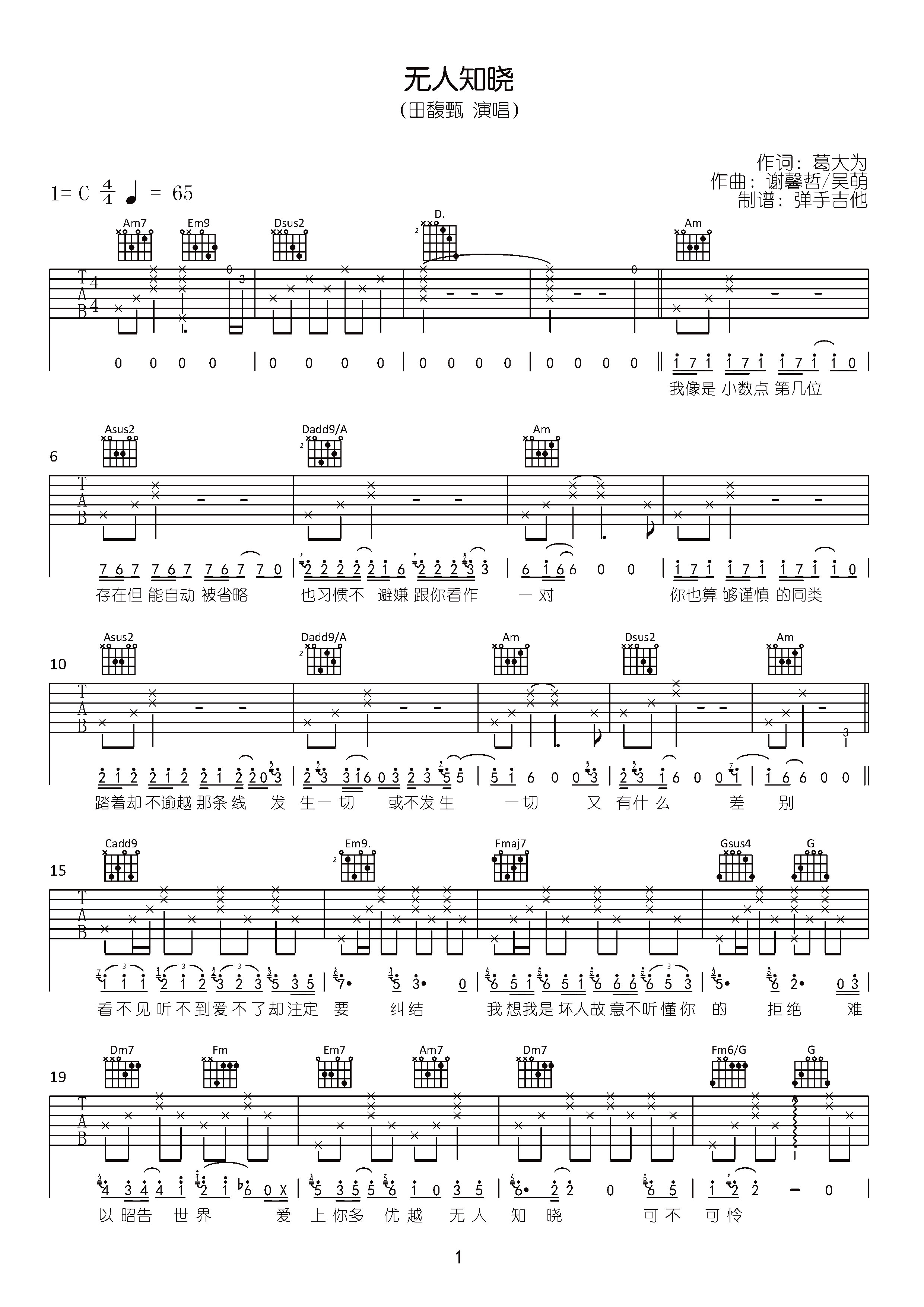 无人知晓吉他谱 - 田馥甄 - C调吉他弹唱谱 - 原版