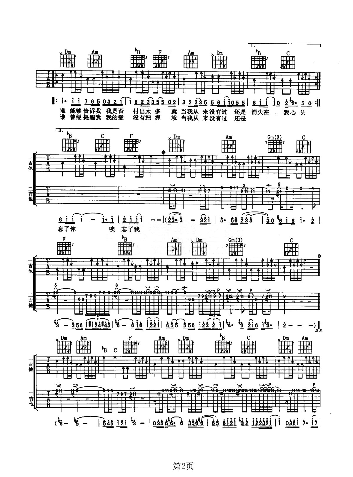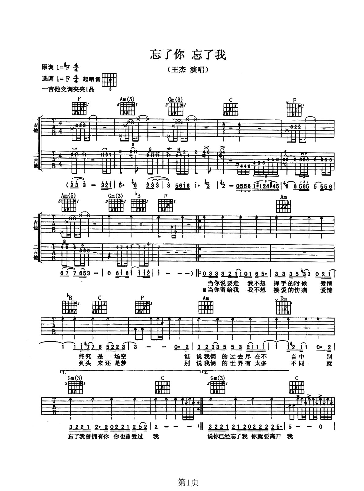 曲谱介绍: 《忘了你忘了我》这首曲谱,总共3张高清图片谱,原调是#F,选用F调,变调夹夹1品可以弹唱原调,前奏部分包含双吉他,扫弦为主要的右手节奏,整体弹唱难度适中。