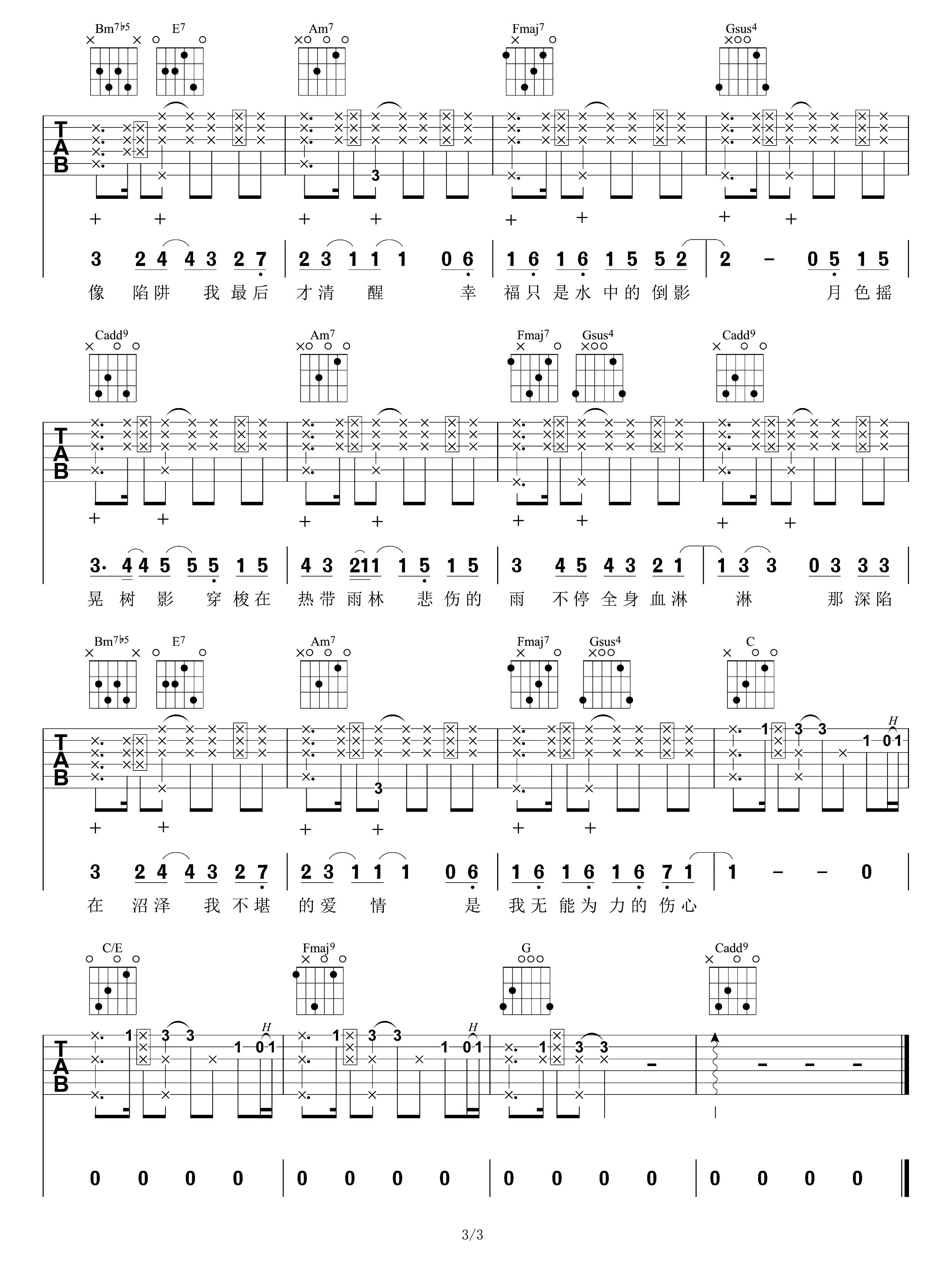 曲谱介绍: 这首曲谱是由喵了个艺编配制谱,原调#C,选用C调,变调夹夹1品弹唱原调,包含拍弦的一些技巧,弹唱难度适中,还原效果也是非常不错的,推荐参考下方演示视频练习。 《热带雨林》吉他弹唱演示视频