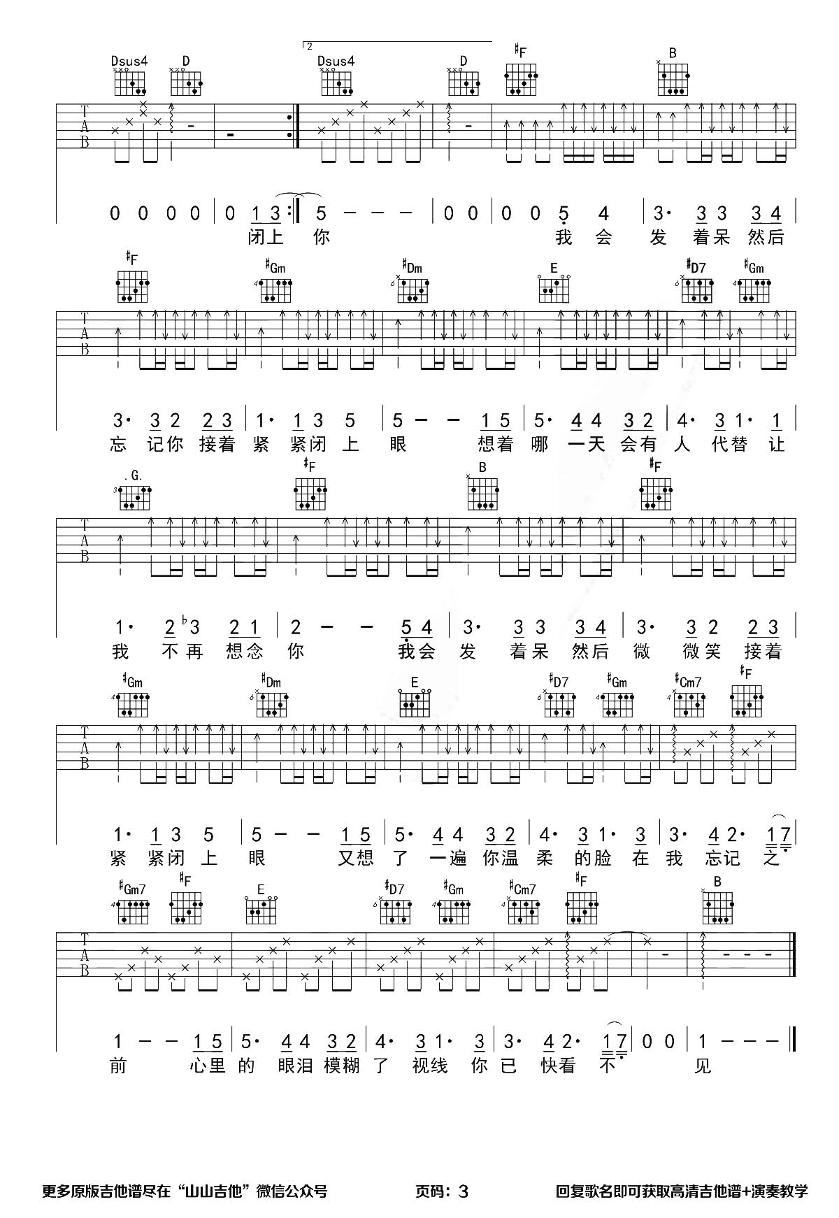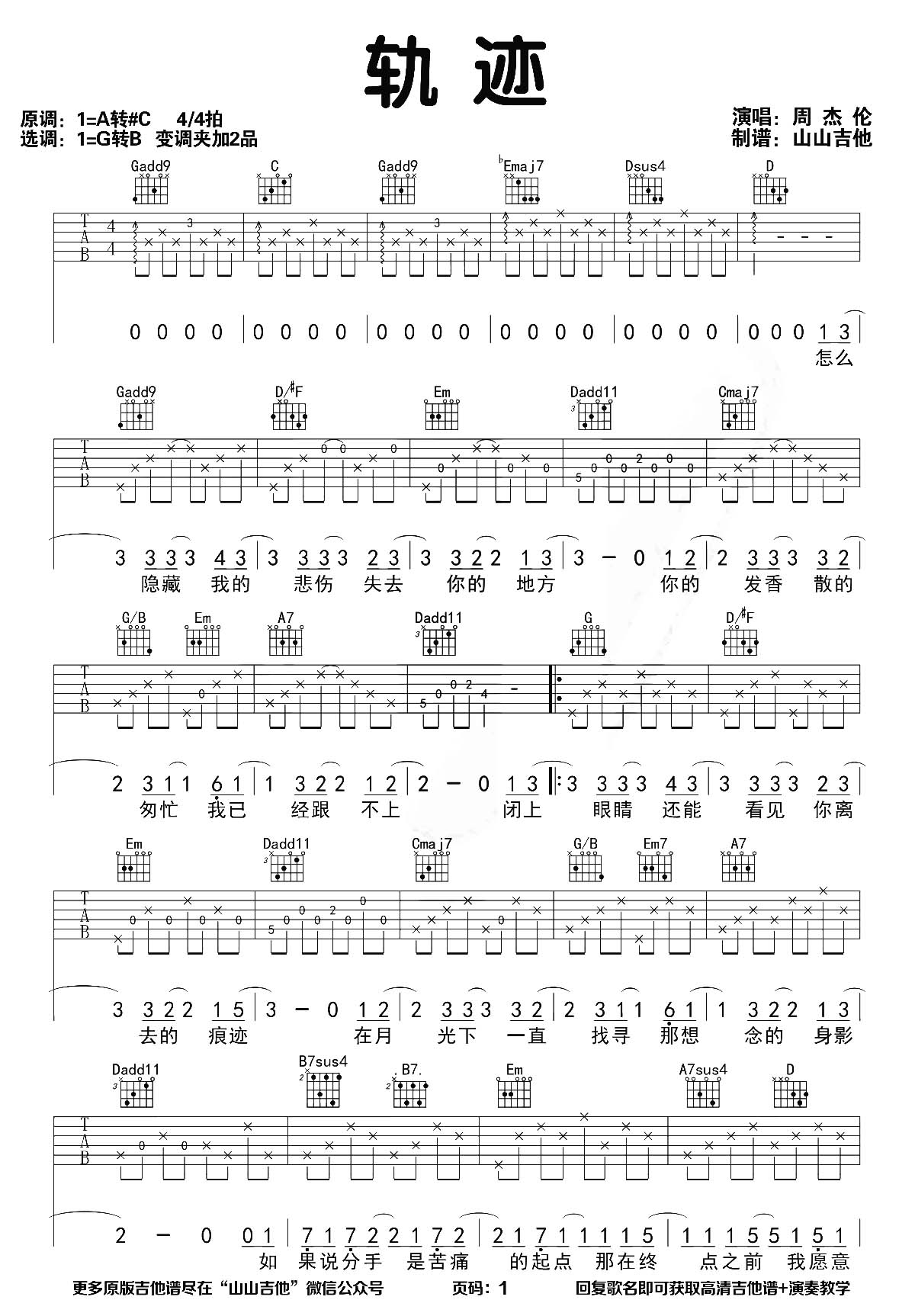 曲谱介绍: 《轨迹》吉他弹唱谱,总共3张高清图片谱,由山山吉他制谱,原调A转#C,选用G转B,变调夹夹2品弹唱原调,大家可参考下方山山吉他的演示视频。 《轨迹》吉他弹唱演示视频
