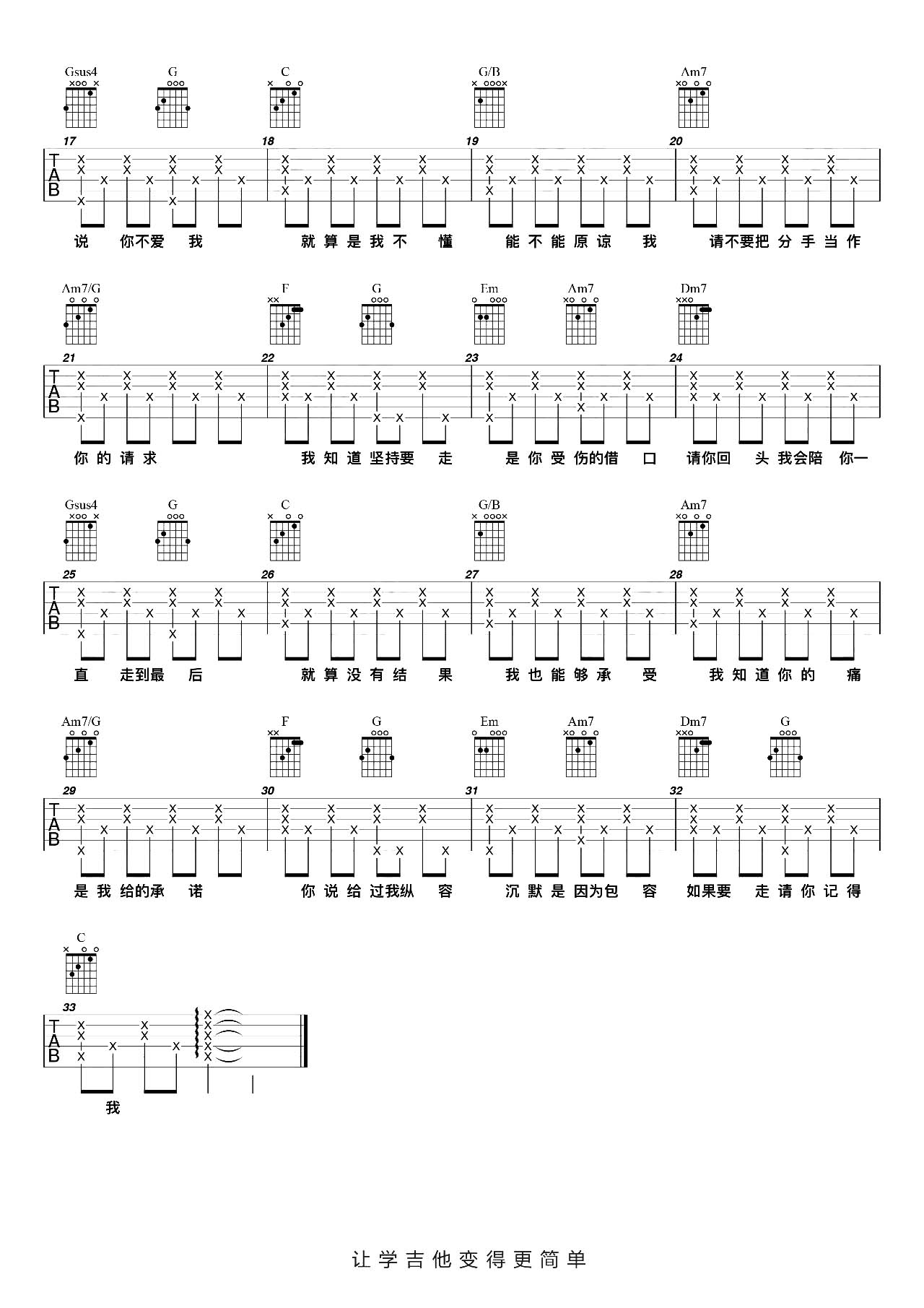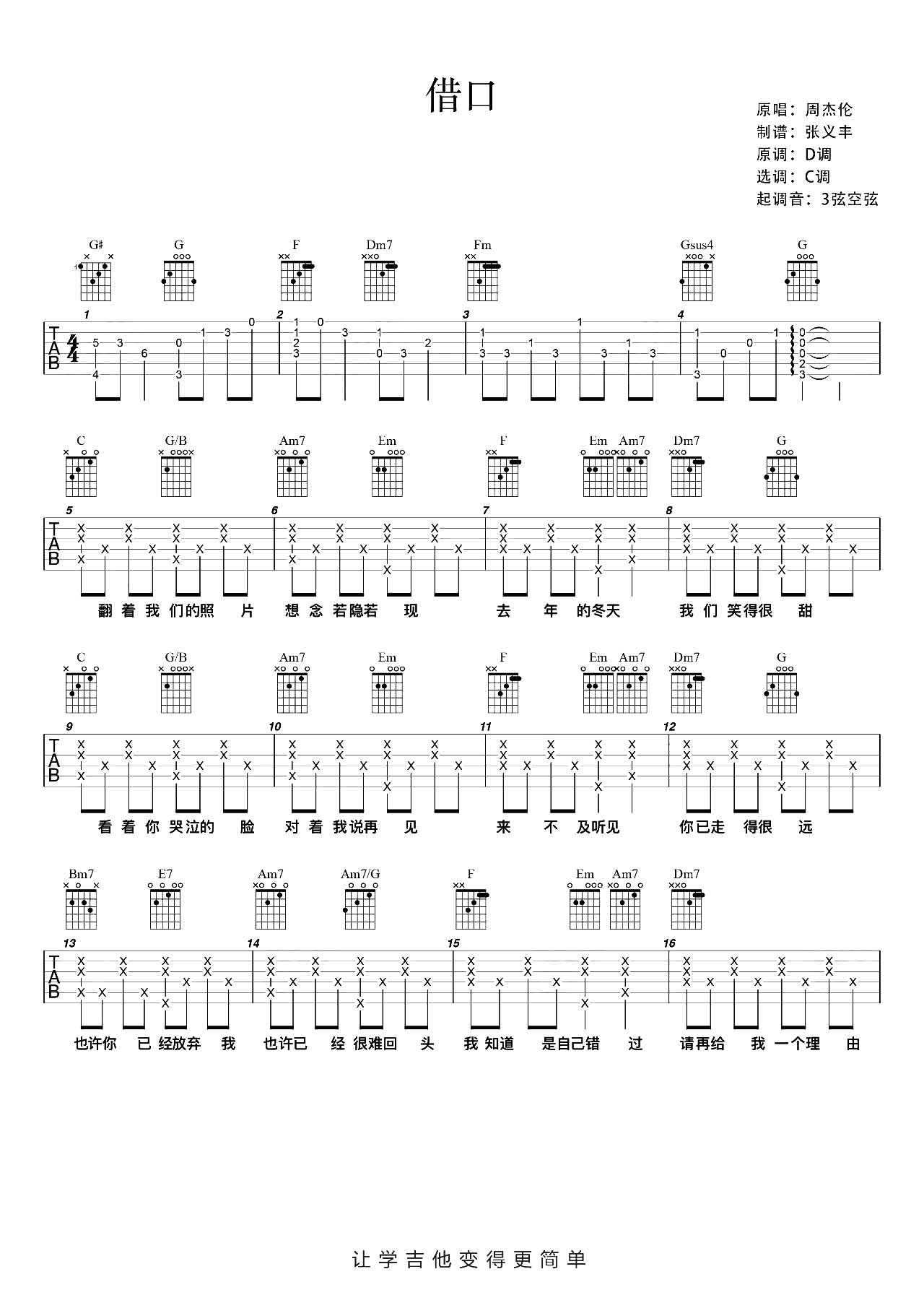 曲谱介绍: 《借口》这个曲谱总共2张高清图片谱,原调D,选用C调,由弦木音乐制谱,版本适合新手练习,弹唱简单。 《借口》吉他弹唱教学视频