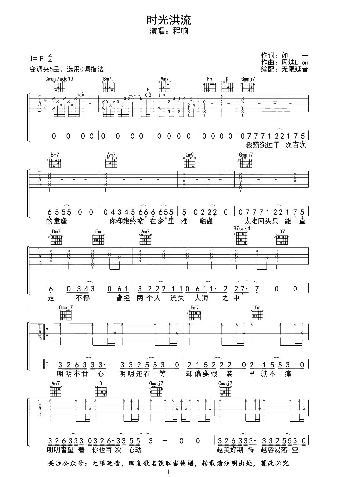 曲谱介绍: 《时光洪流》吉他弹唱谱,原调F,选用C调指法,变调夹夹5品弹唱原调,包含前奏,弹唱难度不大。