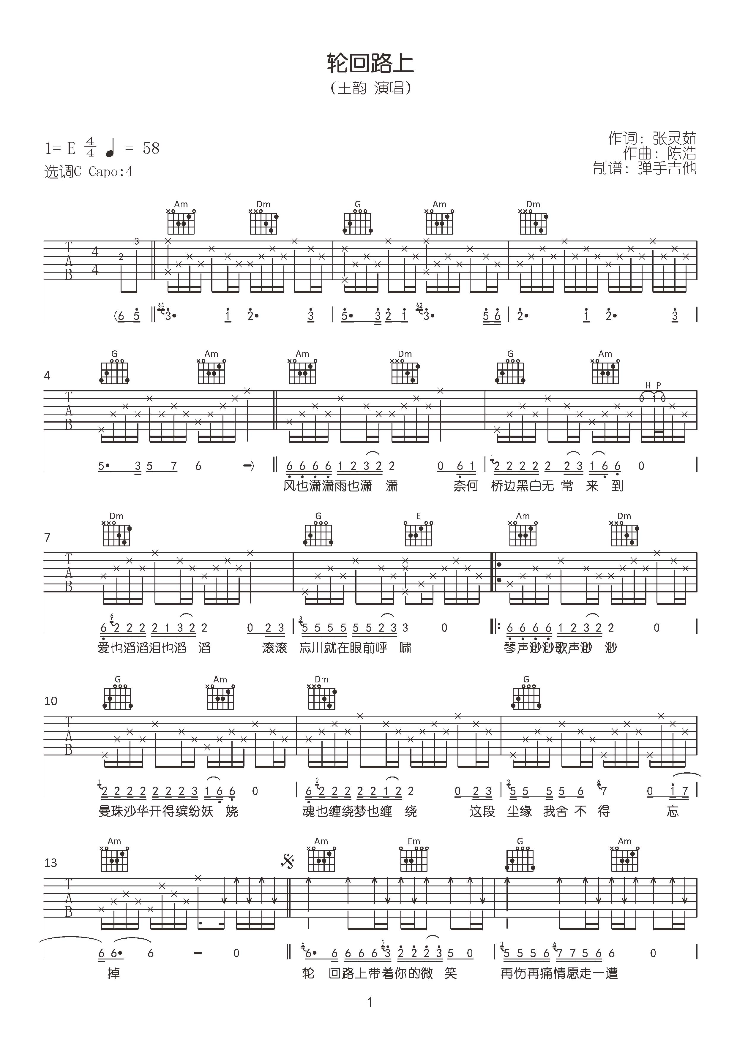 曲谱介绍: 《轮回路上》吉他弹唱谱,原调E调,选用C调指法,变调夹夹4品弹唱原调,速度58拍,弹唱难度不大,还原度较高。