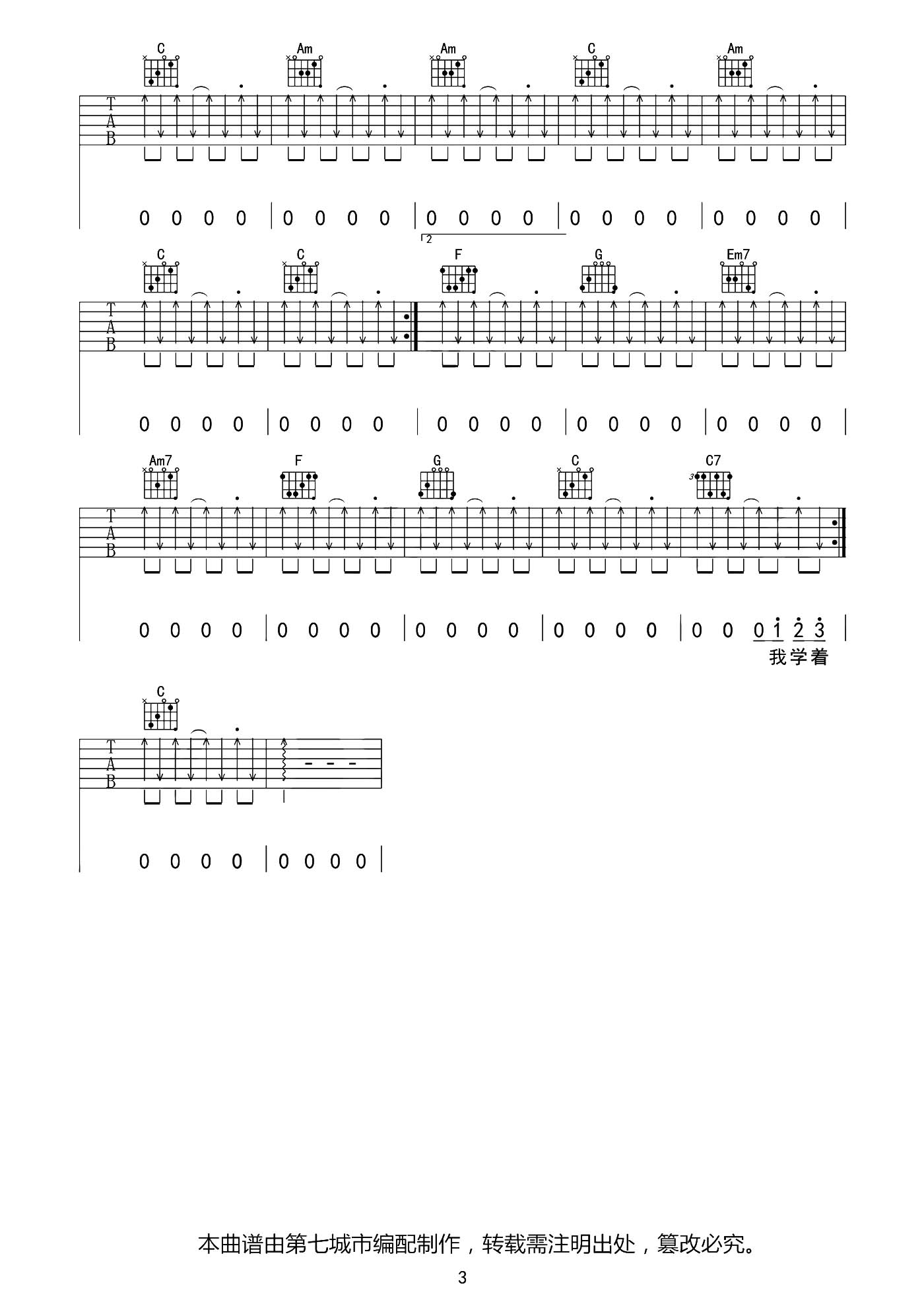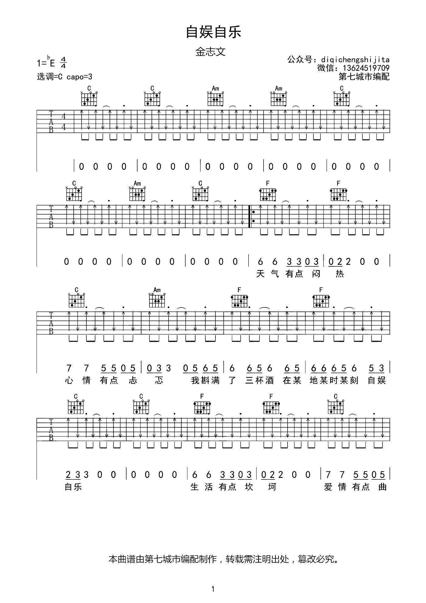 曲谱介绍: 《自娱自乐》这首曲谱,总共3张图片谱,原调bE,选用C调指法,变调夹夹3品弹唱原调,全曲以扫弦节奏为主,会有切音技巧的使用。
