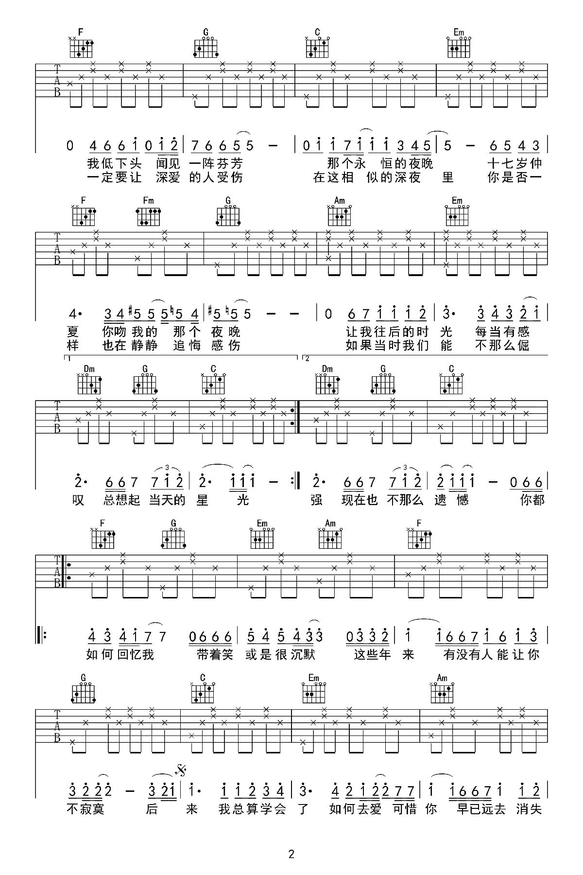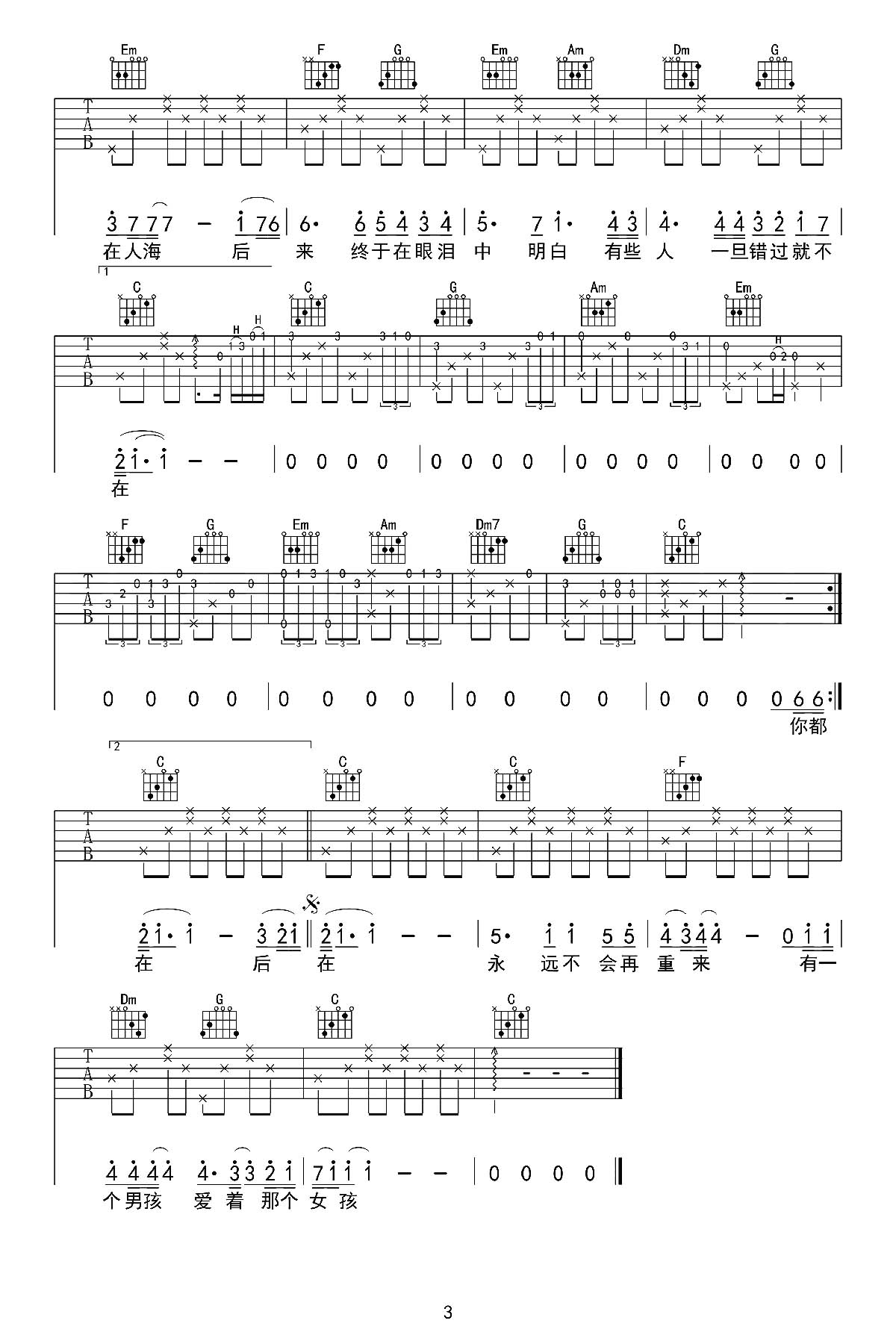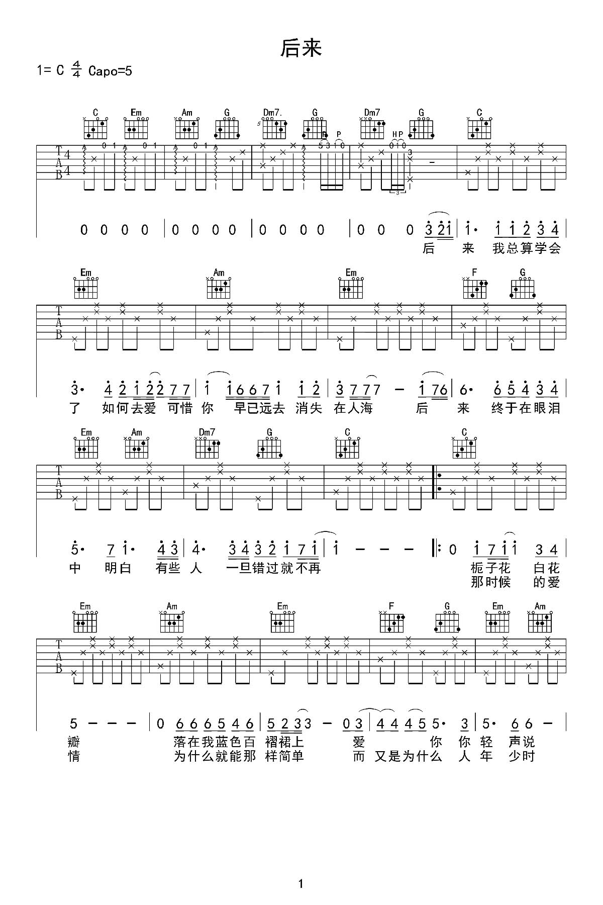 曲谱介绍: 《后来》吉他谱,由必弹吉他编配,总共3张高清图片谱,原调E调,选用C调指法,变调夹夹5品弹唱原调,包含标准版的前奏间奏,赶紧试弹一下吧!