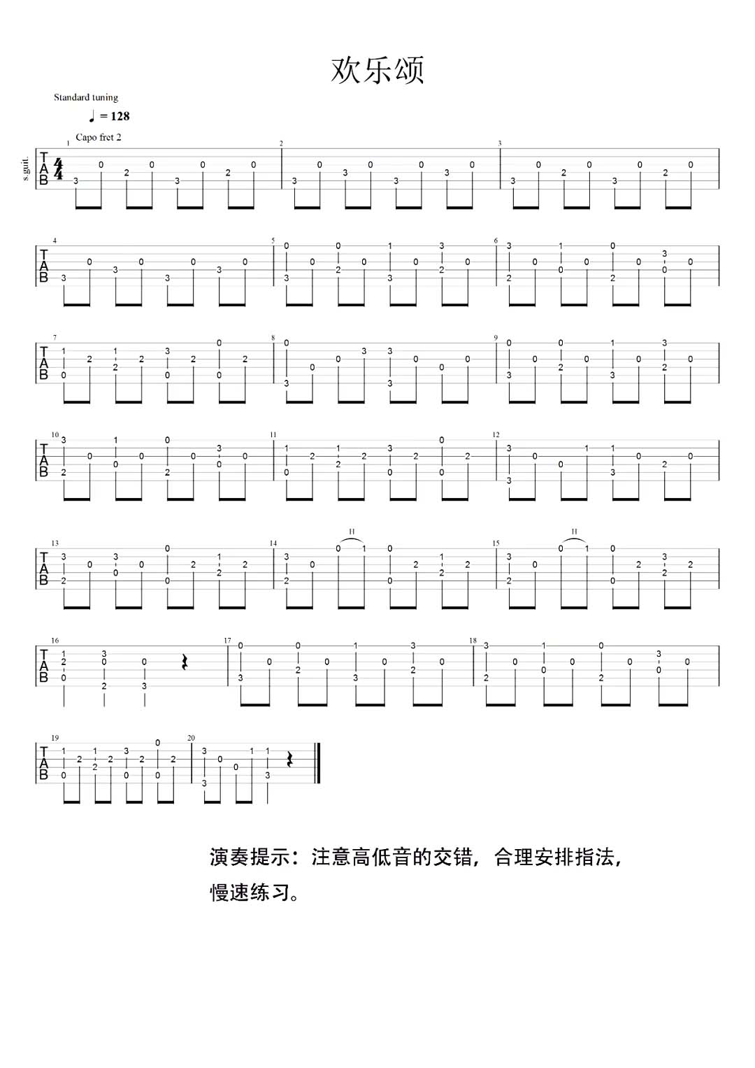 曲谱介绍: 《欢乐颂》吉他指弹谱,总共1张高清图片谱,变调夹夹2品指弹,曲谱难度不算大,注意节拍速率,结合演示视频多加练习。 《欢乐颂》指弹吉他演示视频