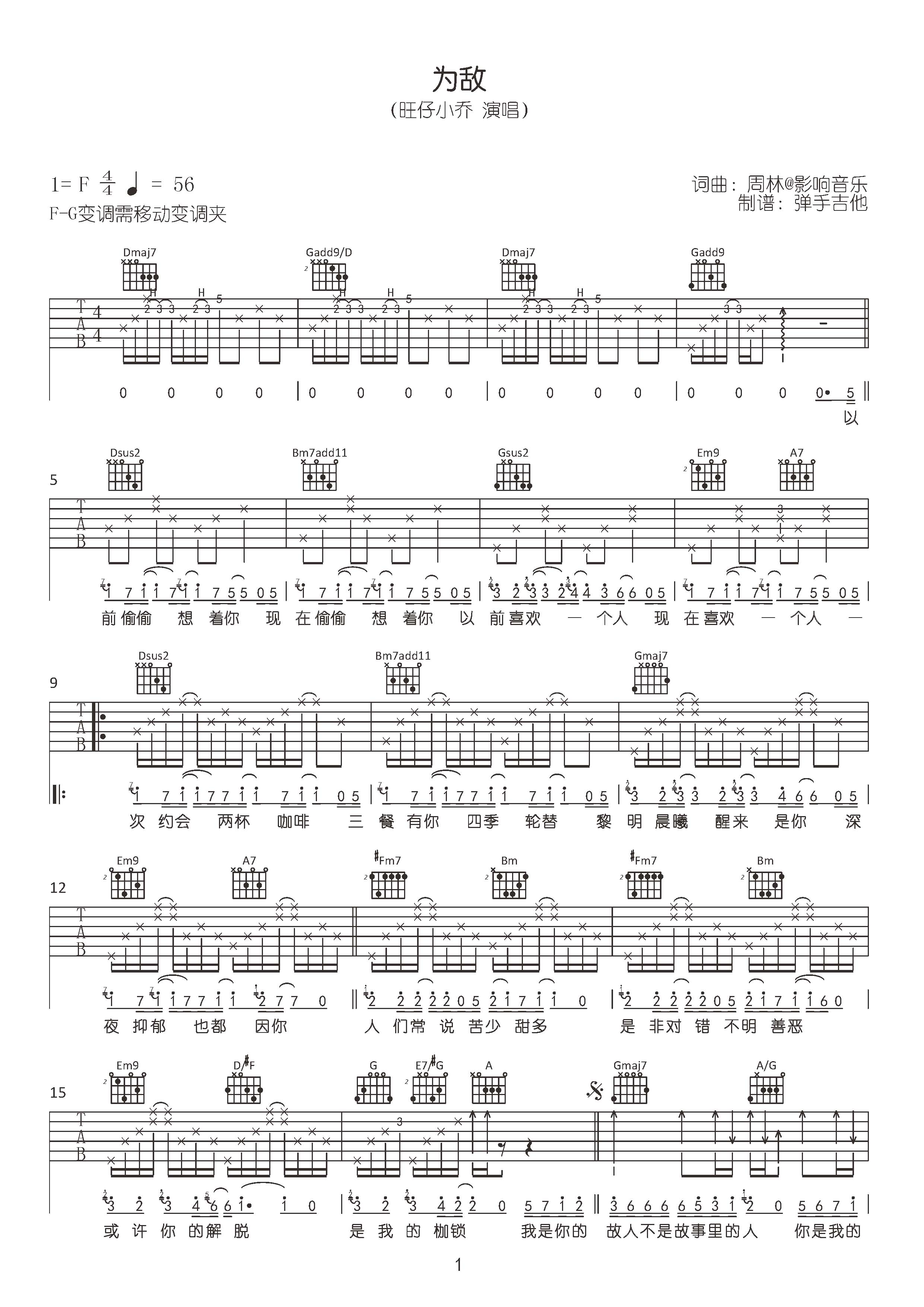 曲谱介绍: 《为敌》弹唱谱,原调F调,选用F-G调,变调需要移动变调夹。