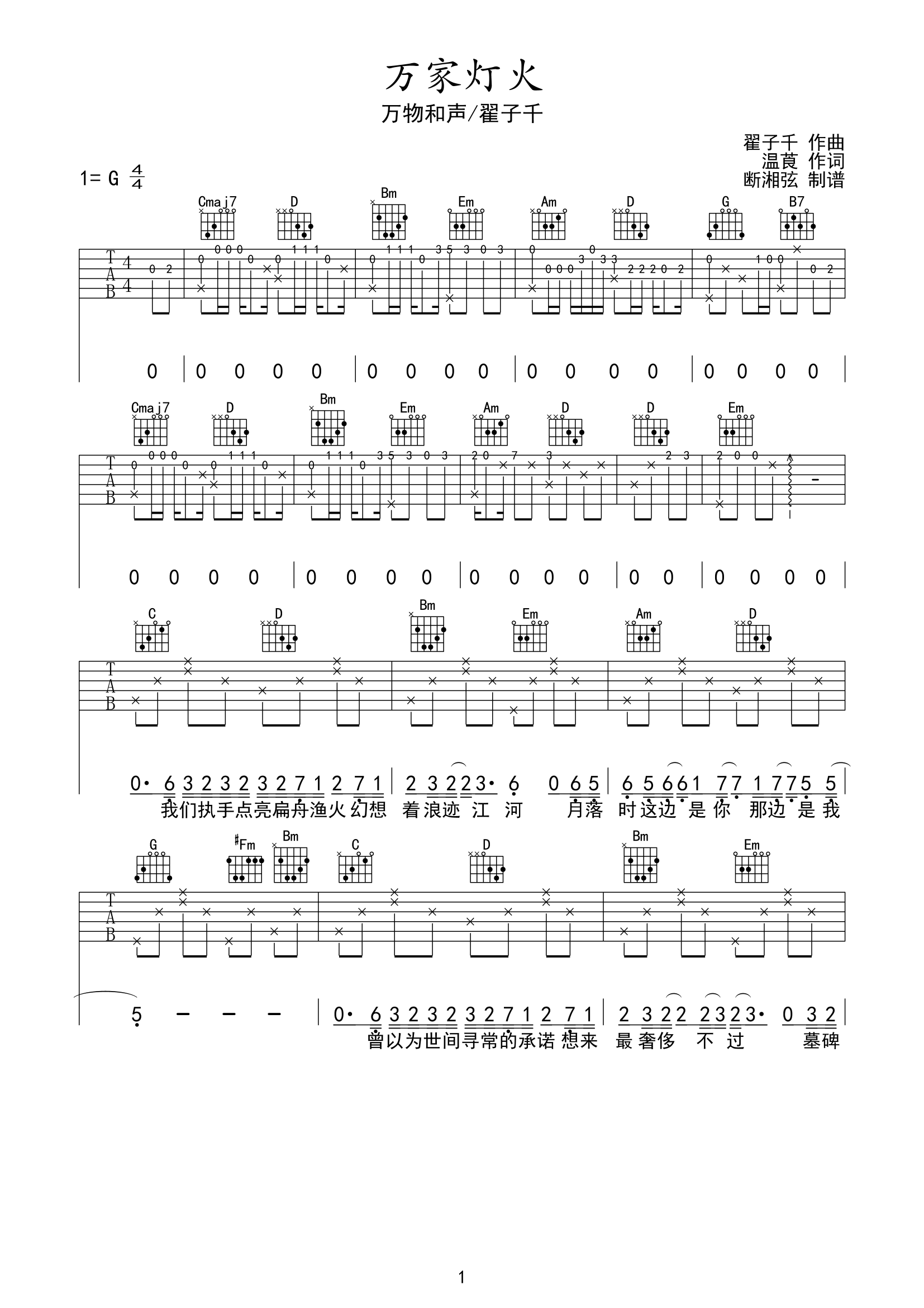 万家灯火吉他谱 - 瞿子千/万物和声 - G调吉他弹唱谱 - 原版