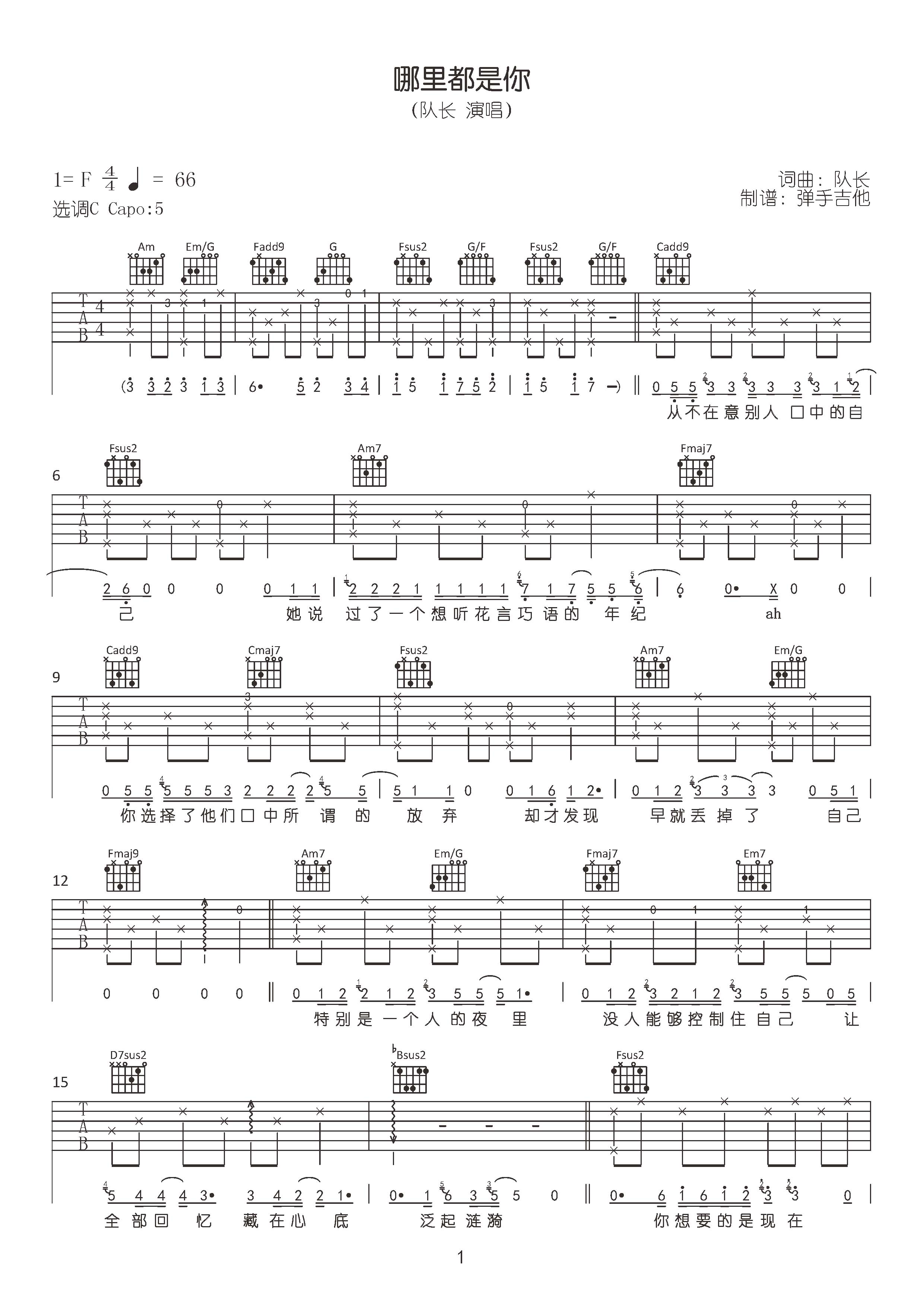 曲谱介绍: 《哪里都是你》这首曲谱,原调F调,选用C调指法,变调夹夹5品弹唱原调,曲谱按原版编配,赶紧试弹一下吧!