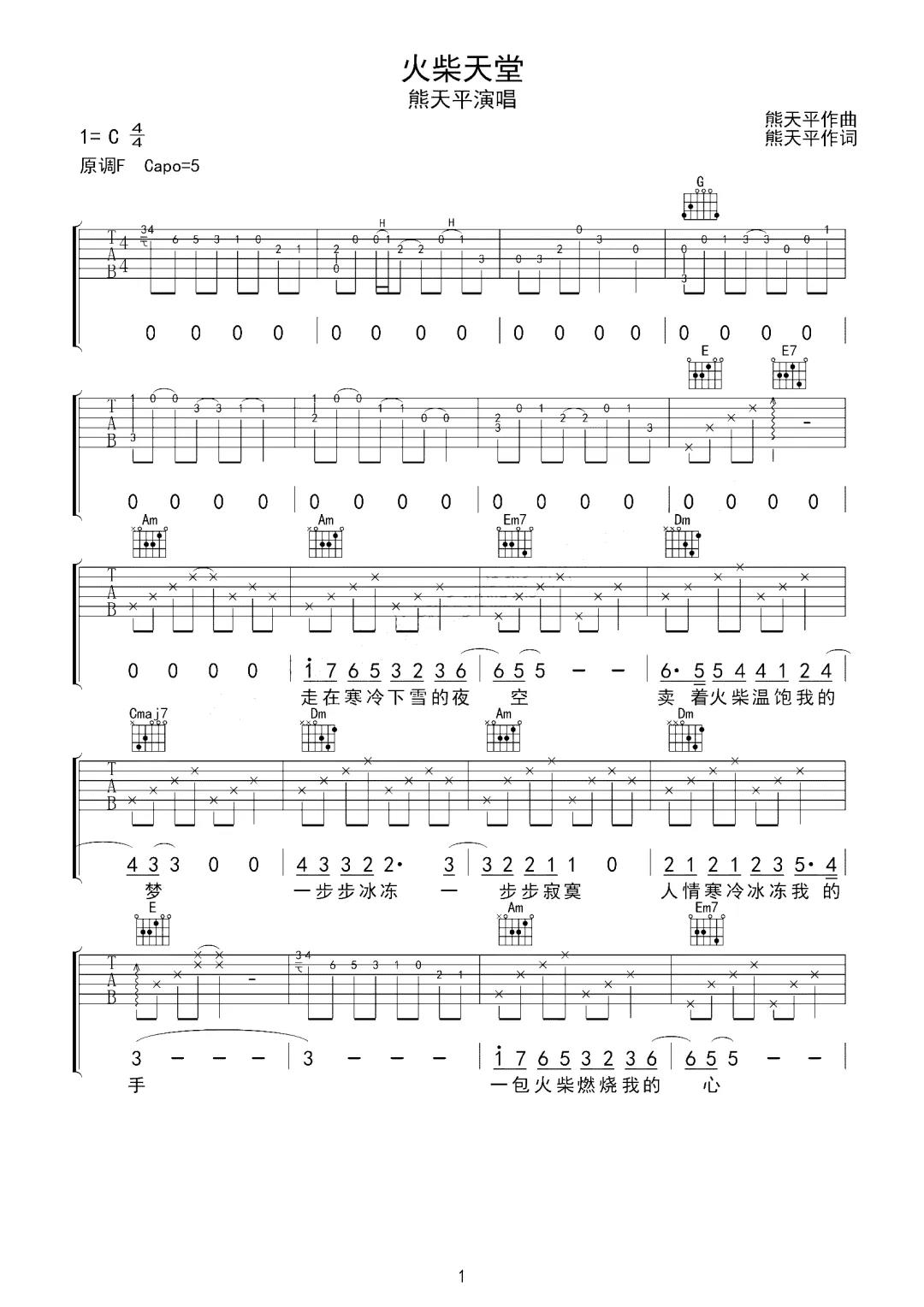 火柴天堂吉他谱 - 熊天平 - C调吉他弹唱谱 - 原版