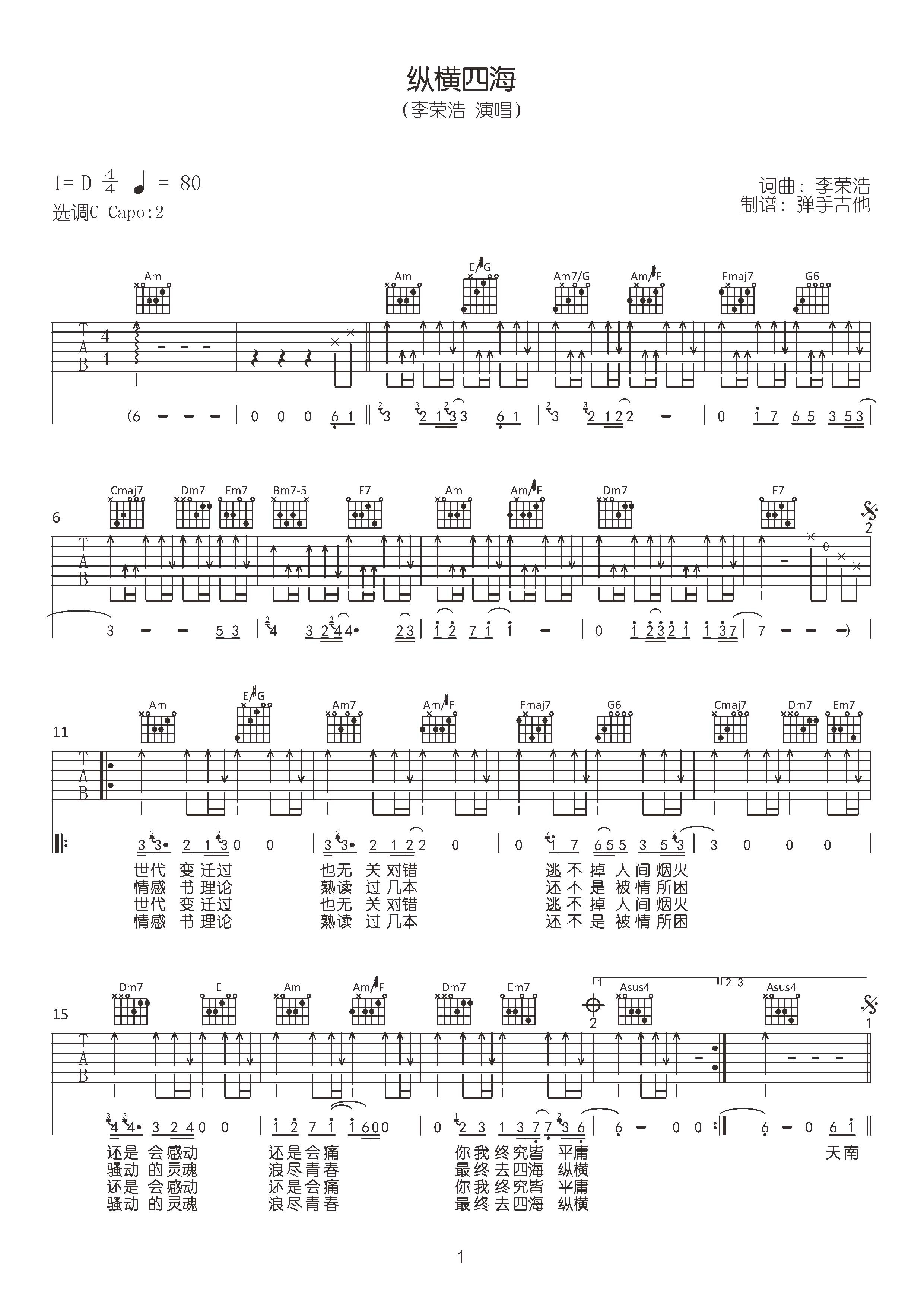 纵横四海吉他谱 - 李荣浩 - C调吉他弹唱谱 - 原版