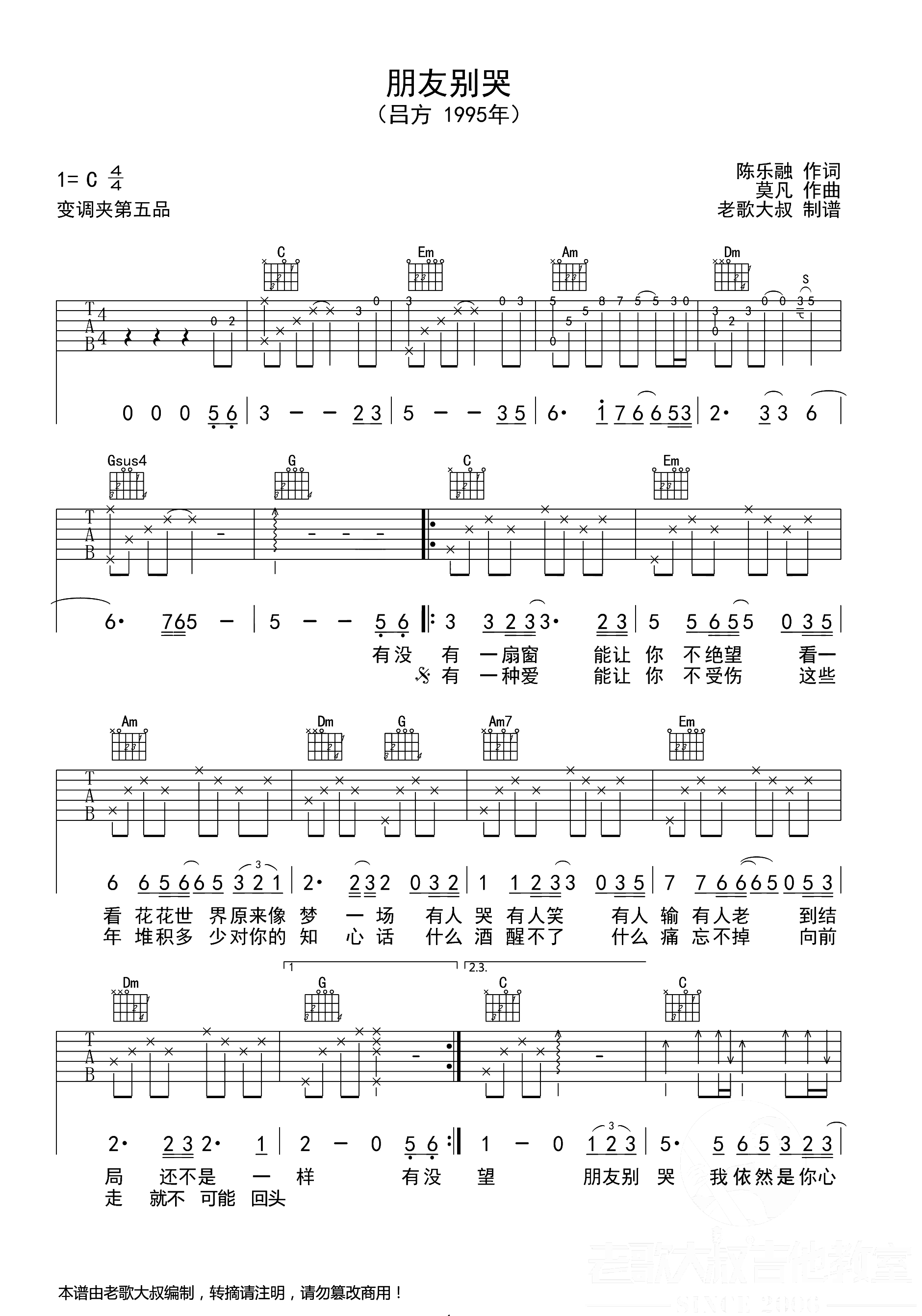 朋友别哭吉他谱 - 吕方 - C调吉他弹唱谱 - 原版