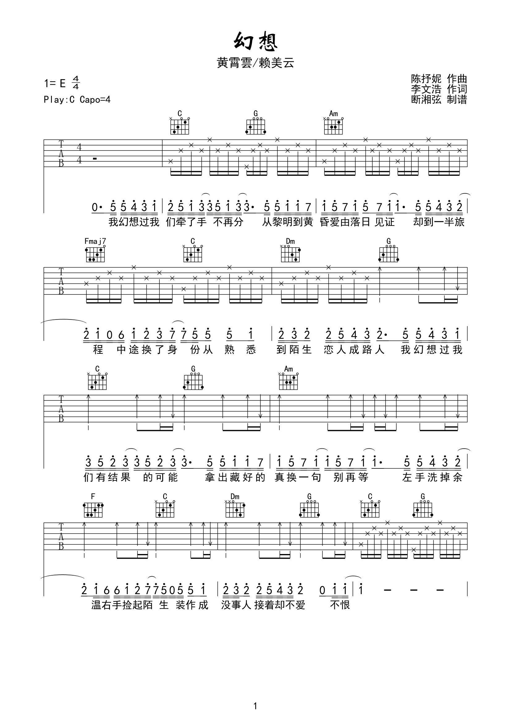 曲谱介绍: 《幻想》吉他弹唱谱,总共3张高清图片谱,本谱为C调编配,变调夹夹4品弹唱原调E调。