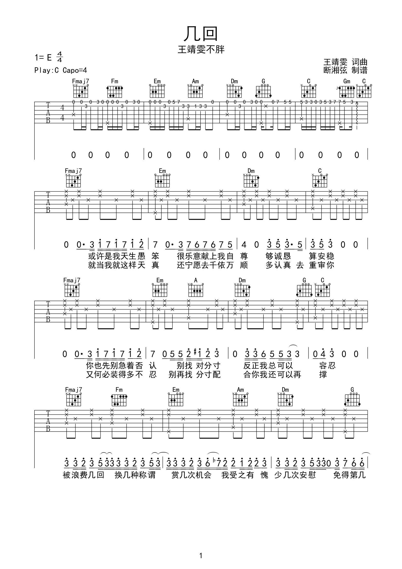 几回吉他谱 - 王靖雯 - C调吉他弹唱谱 - 原版