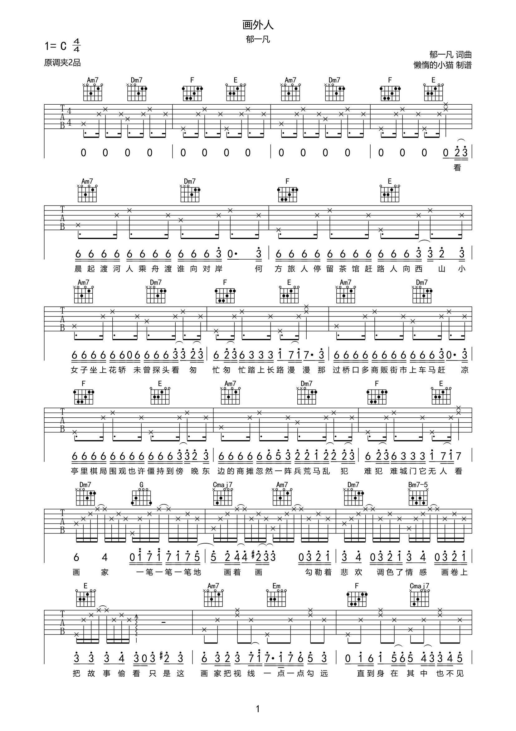 曲谱介绍: 《画外人》吉他弹唱谱,总共3张高清图片谱,由懒惰的小猫制谱,总共3张高清图片谱,选用C调指法,原调为D调,变调夹可以夹2品弹唱,整体难度不大,易上手。