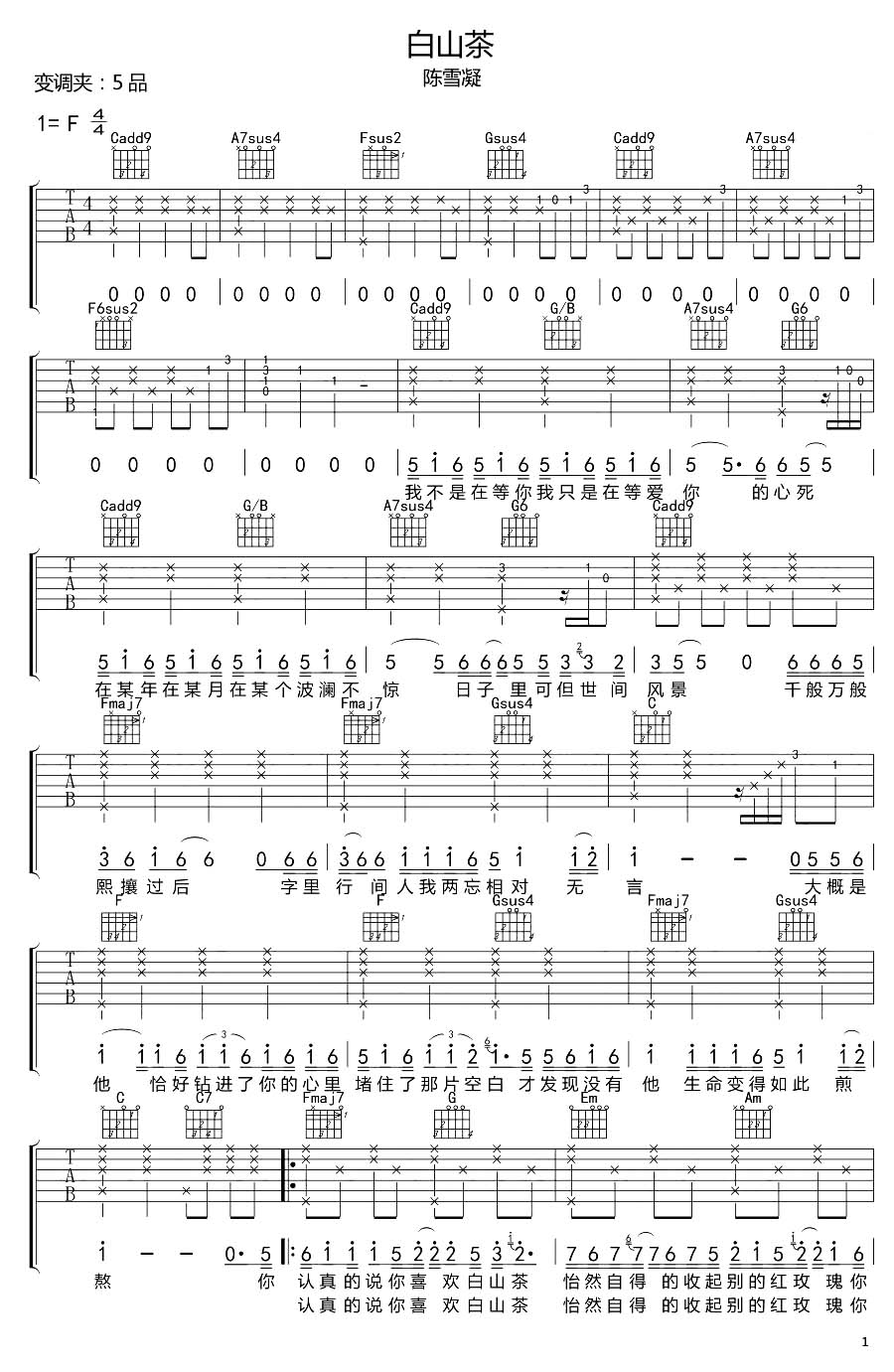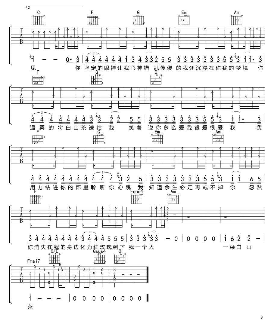 曲谱介绍: 《白山茶》这首曲谱,总共3张高清图片谱,选用C调指法,原调F调,变调夹5品弹唱原调。