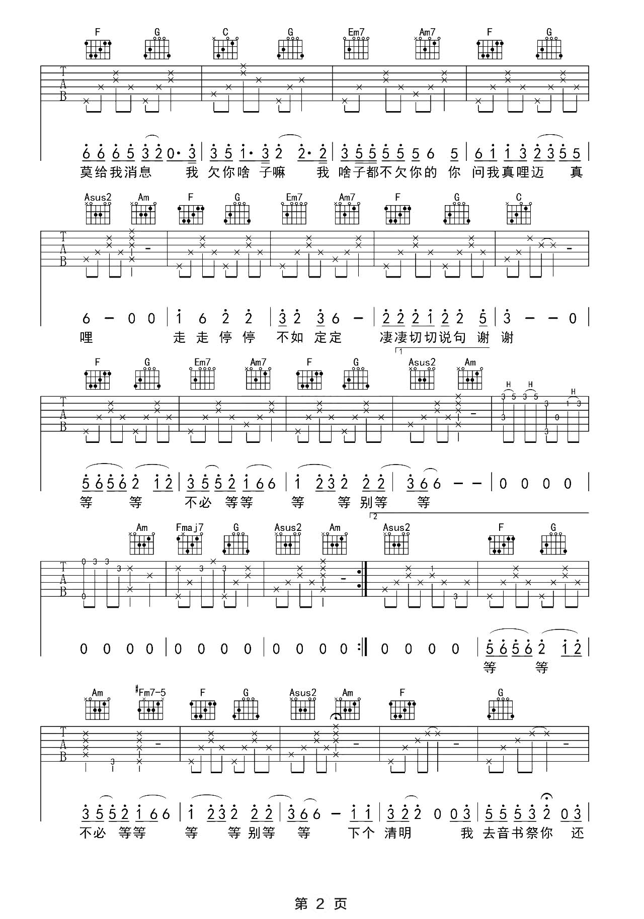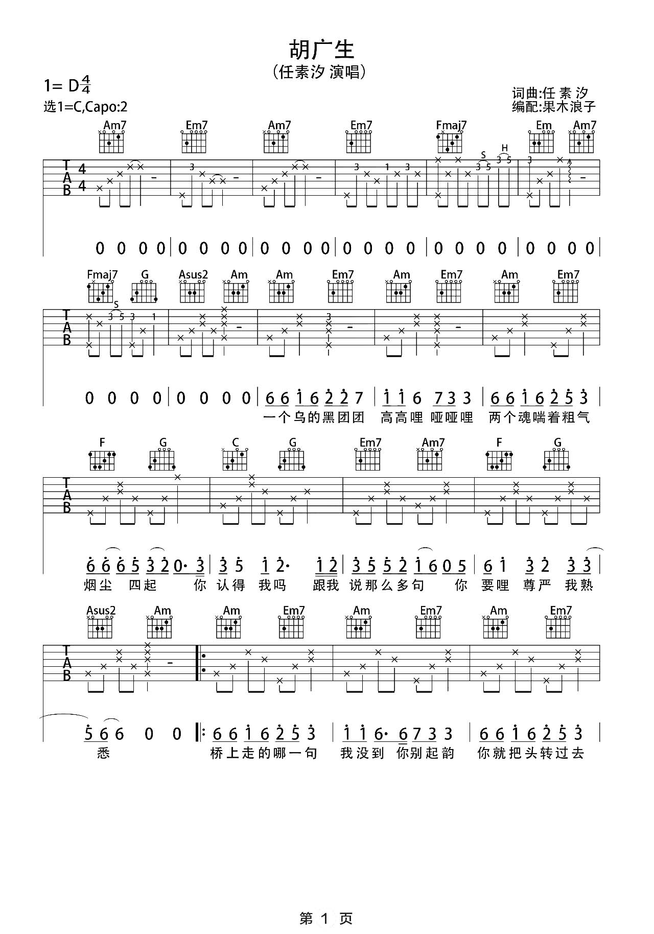 曲谱介绍: 这首曲谱由果木浪子制谱,共3张高清图片谱例,原调D,选用C调指法,变调夹夹二品,建议参考教学视频练习。 《胡广生》吉他弹唱教学视频
