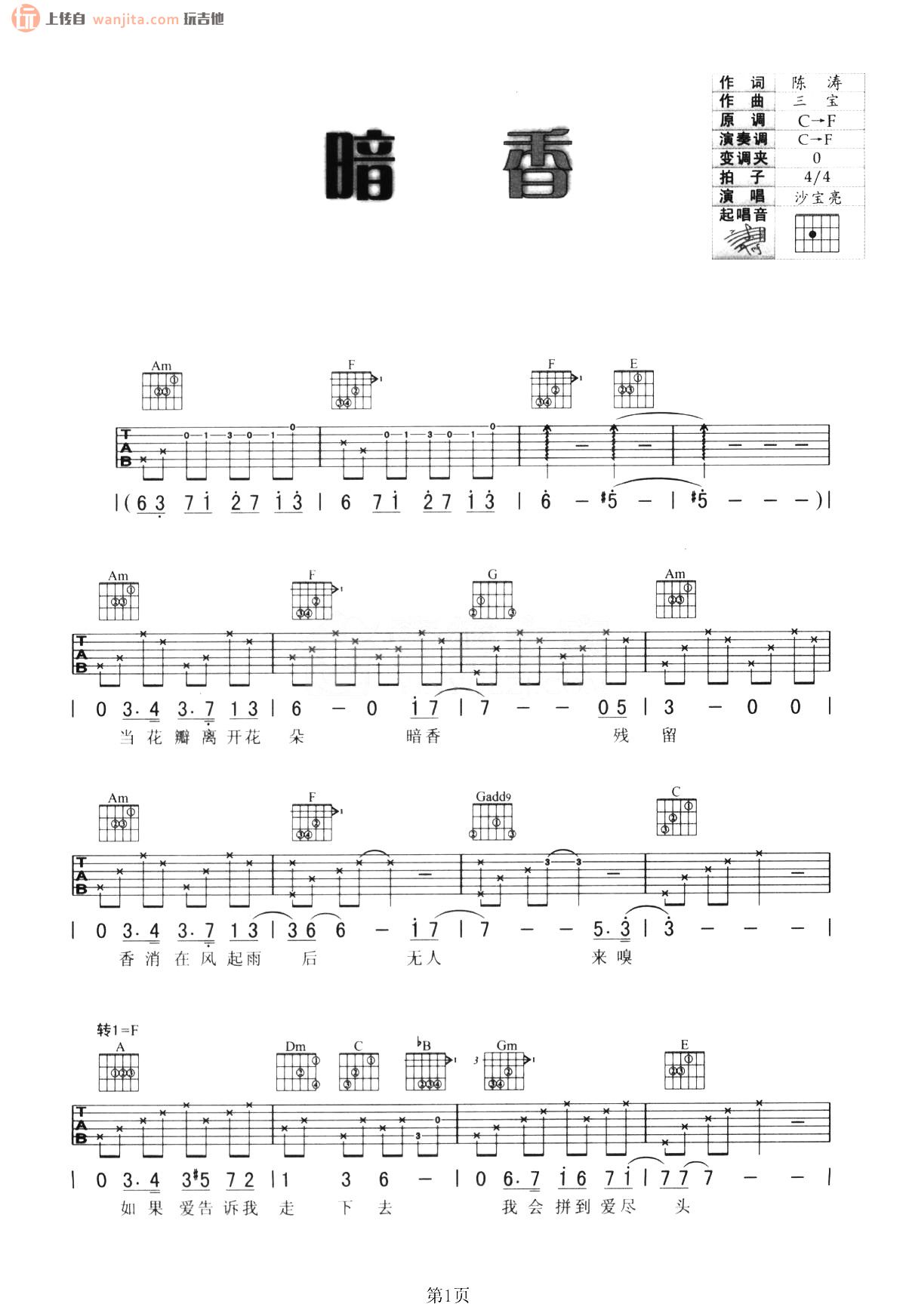 曲谱介绍: 暗香吉他弹唱谱,原调和选调均为C转F,不使用变调夹。这首歌曲难度属于中等,适合进阶练习,大家在学习的时候要注意这首伤感歌曲的间奏,多多练习。
