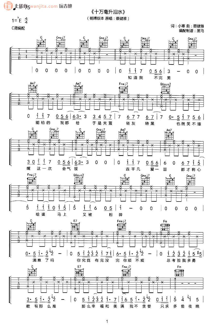 曲谱介绍: 《十万毫升泪水》吉他弹唱谱,原调bE,C调编配,不使用变调夹,歌曲弹唱难度一般,要注意左手和弦的变化,运用到较多的和弦演奏,比较好听的一首伤感流行歌曲。