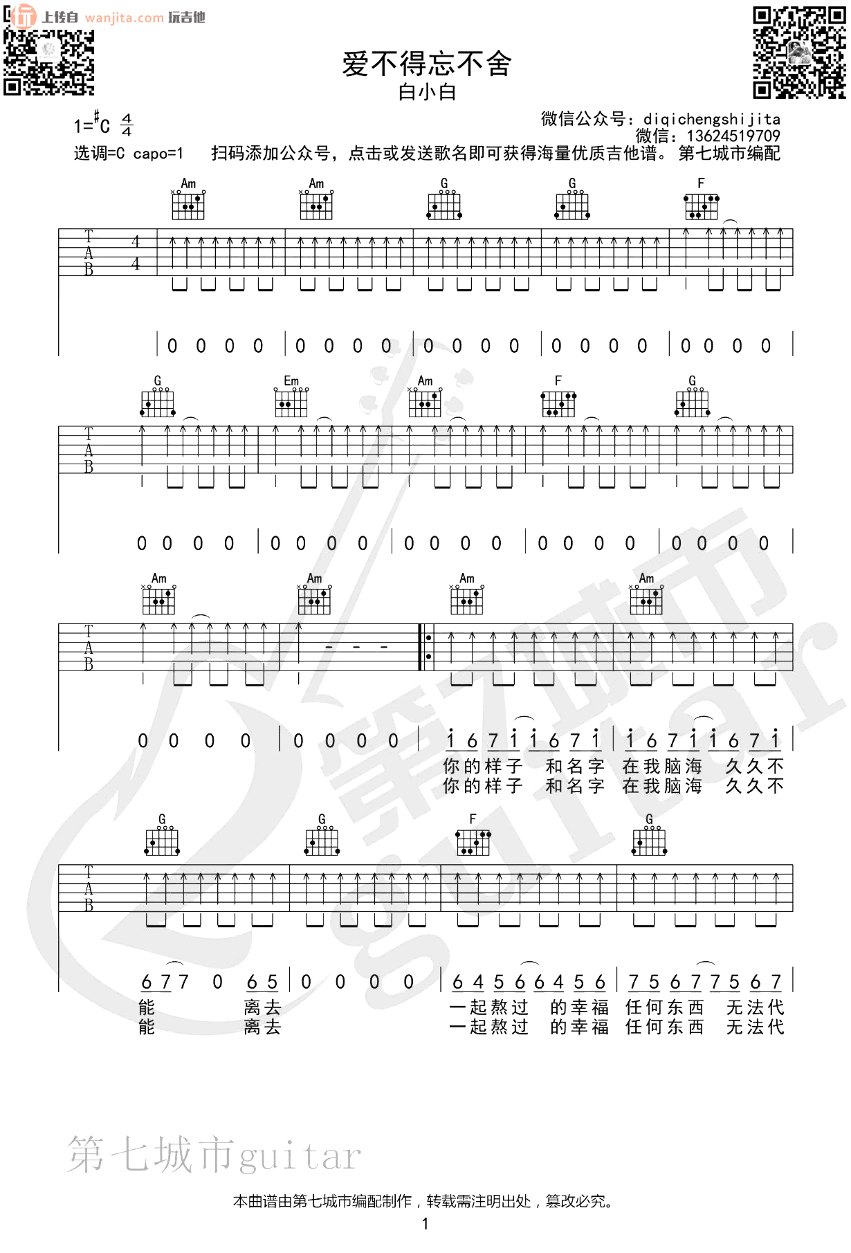 爱不得忘不舍吉他谱 - 白小白 - C调吉他弹唱谱