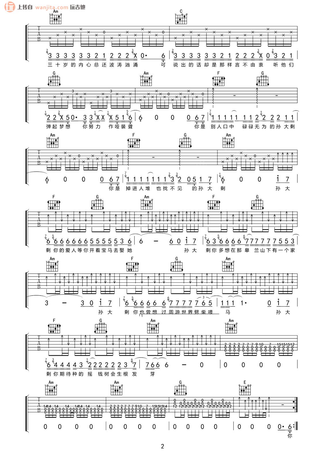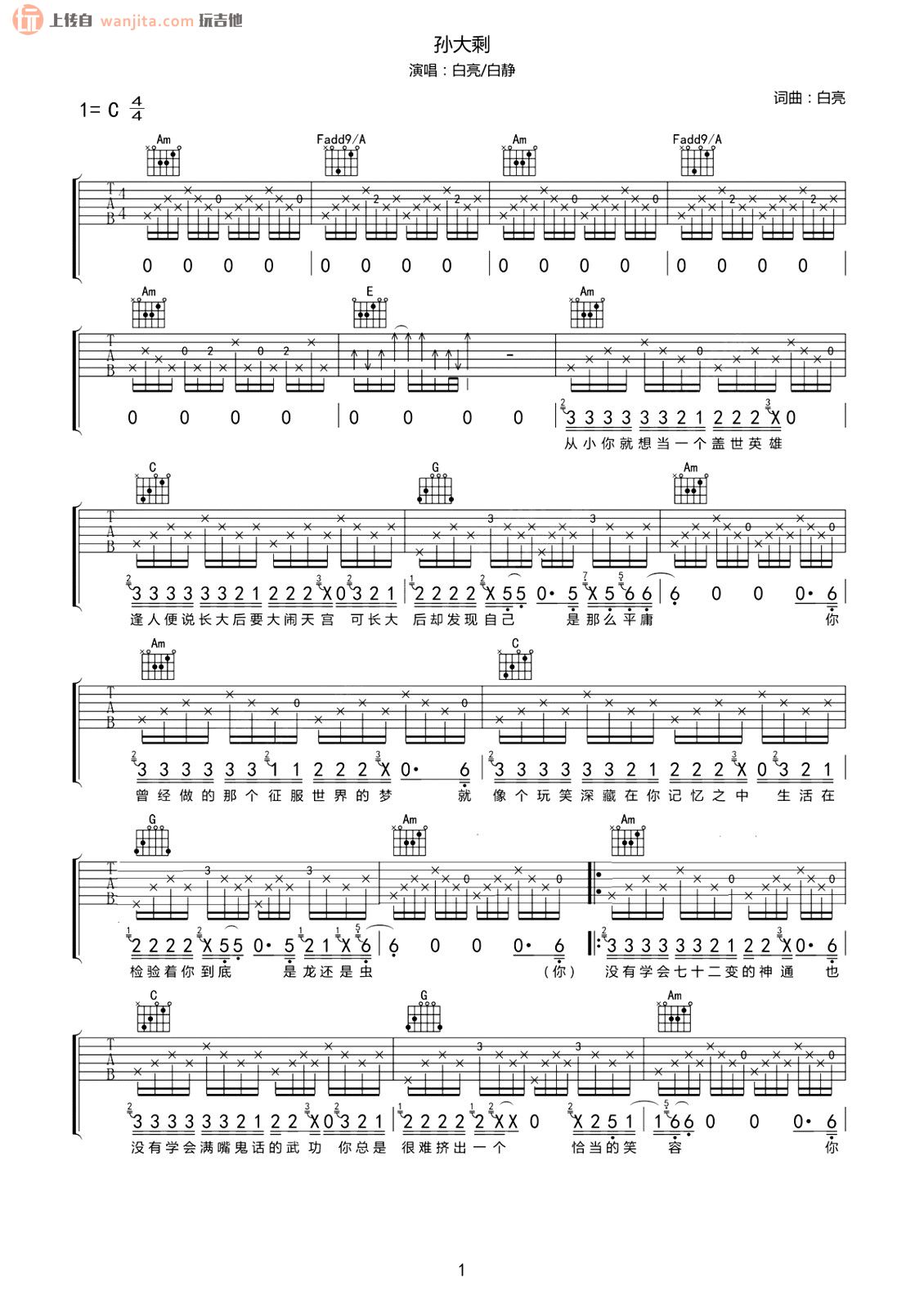 孙大剩吉他谱 - 白亮/赵静 - C调吉他弹唱谱 - 原版