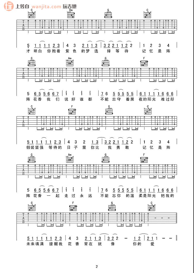 曲谱介绍: 花香C调六线谱,总共2张高清图片谱例,不使用变调夹。这张吉他谱使用简单的一些和弦搭配一些简单的节奏,为大家提供了容易学习的良好途径。这首歌曲更多的是对歌词的把控和节奏的运用。一首充满岁月和回忆的歌曲。