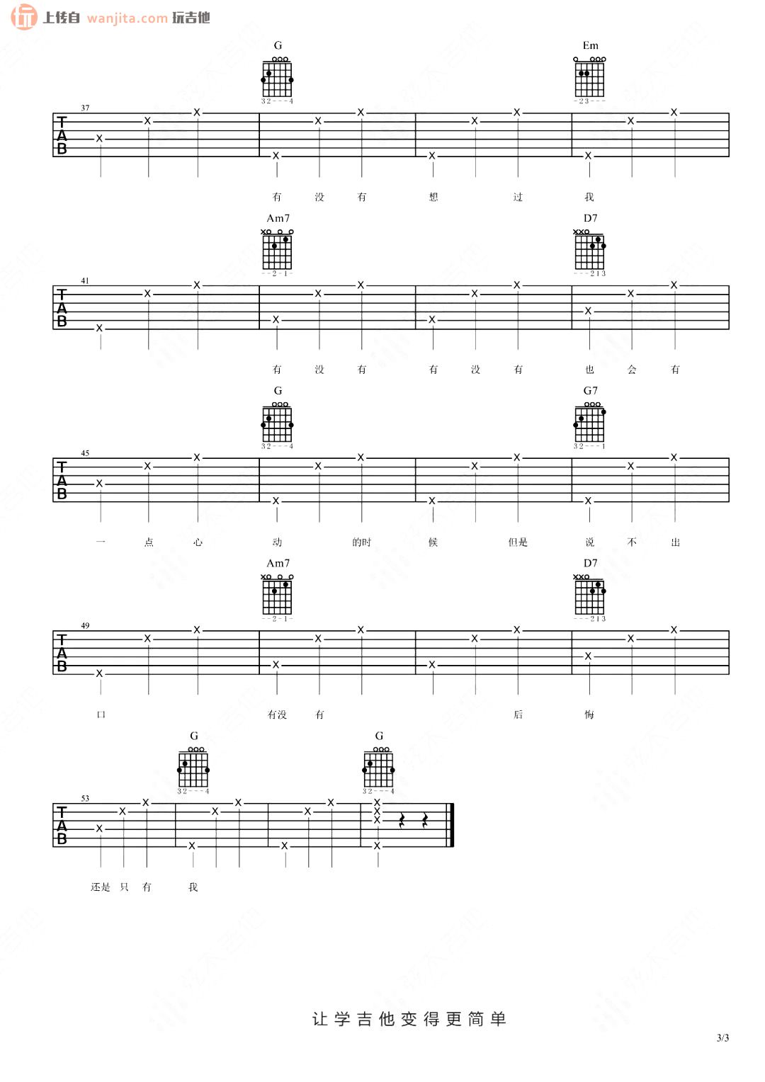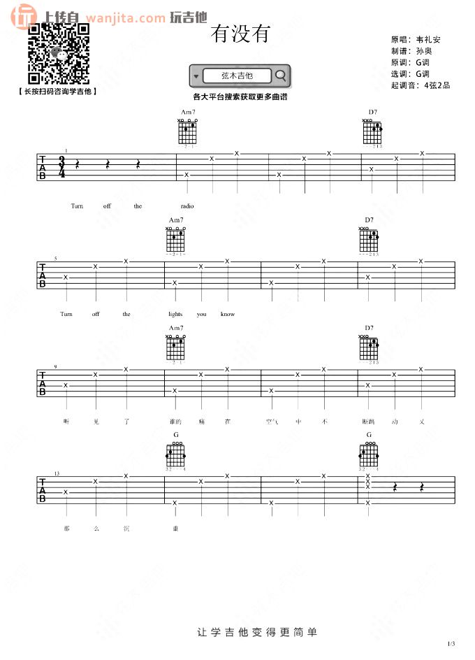 曲谱介绍: 有没有C调六线谱,不使用变调夹。歌曲整体不算难,这首有没有主要表达的是表白后失败的情感和暗恋的不舍和难受,所以吉他能很好地搭配这首歌,很适合吉他弹唱的一首流行伤感音乐。 有没有吉他弹唱演示视频