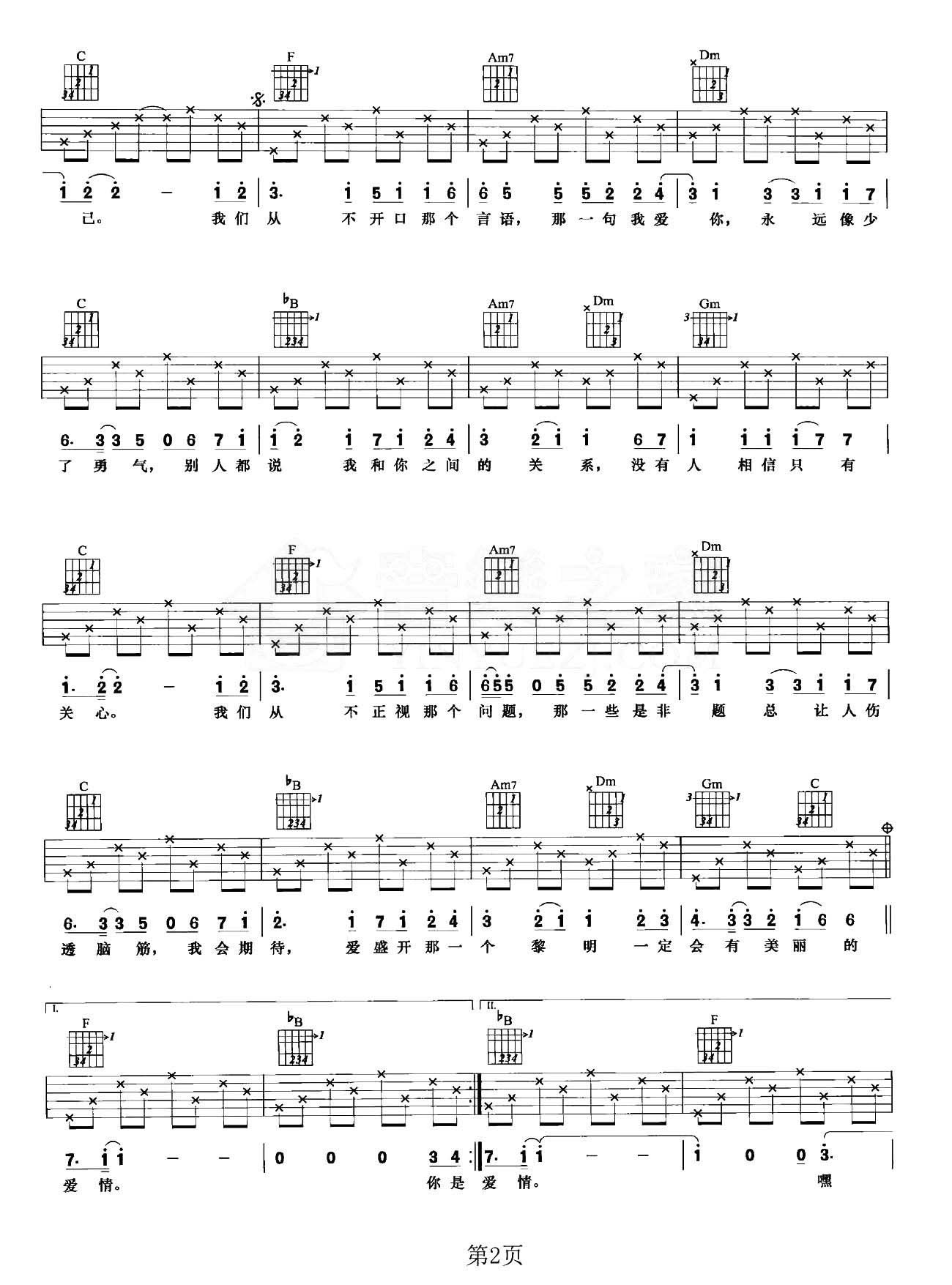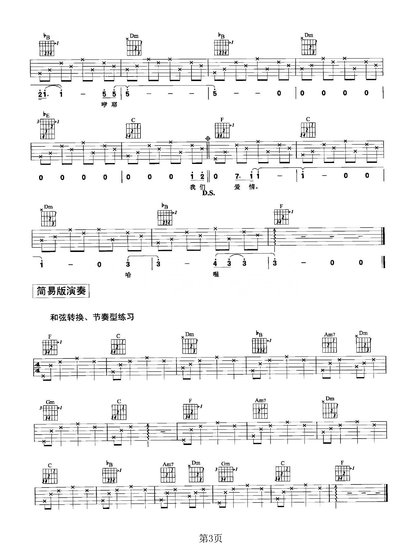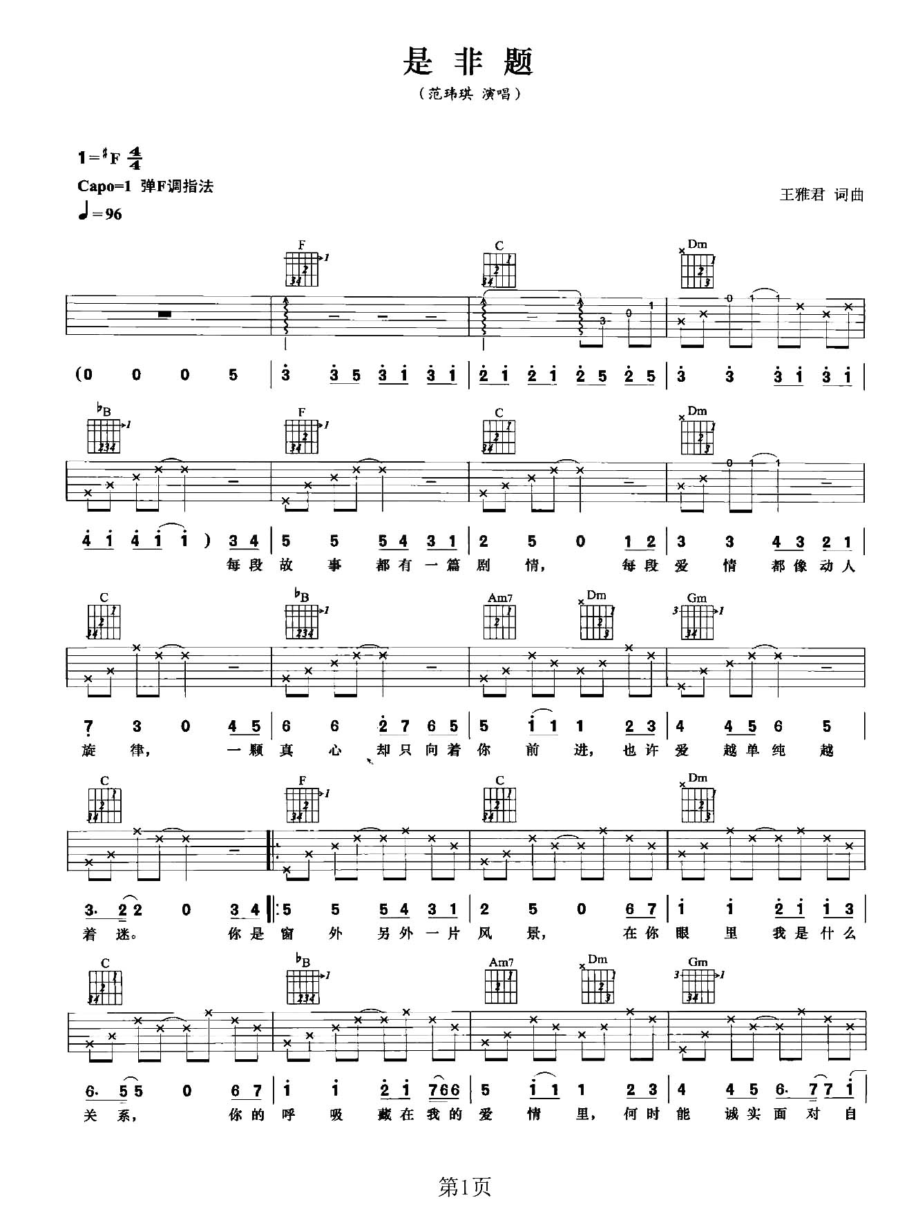 曲谱介绍: 范玮琪《是非题》吉他弹唱谱,采用F调指法编配原版,共有3张高清图谱。