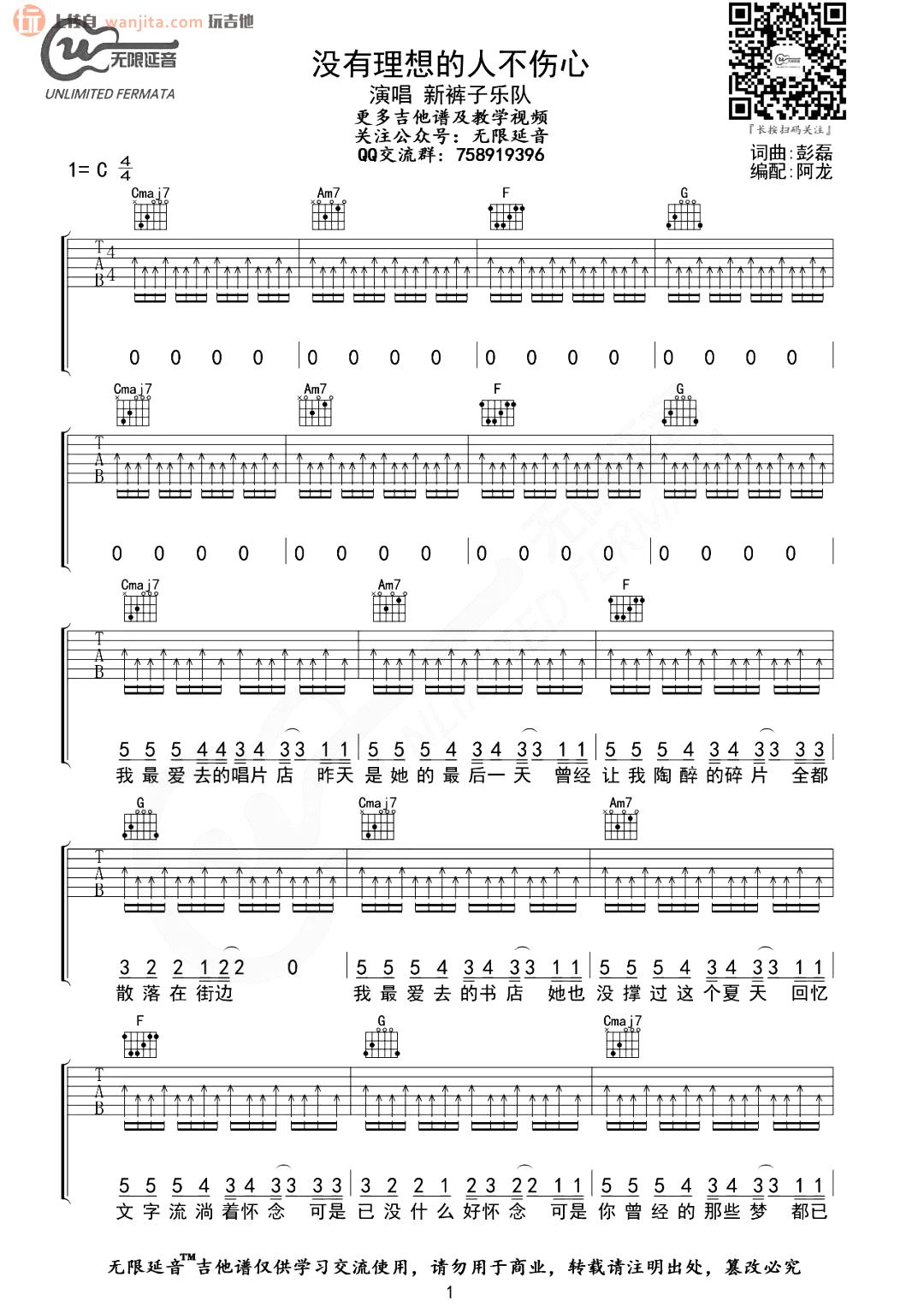 曲谱介绍: 《没有理想的人不伤心》C调六线谱,总共4张高清图片谱例,由阿龙编配分享,不使用变调夹。整张曲谱都通过扫弦来创造节奏,节奏感超强的一首摇滚歌曲,有一定难度的一首歌,不推荐新手学习。
