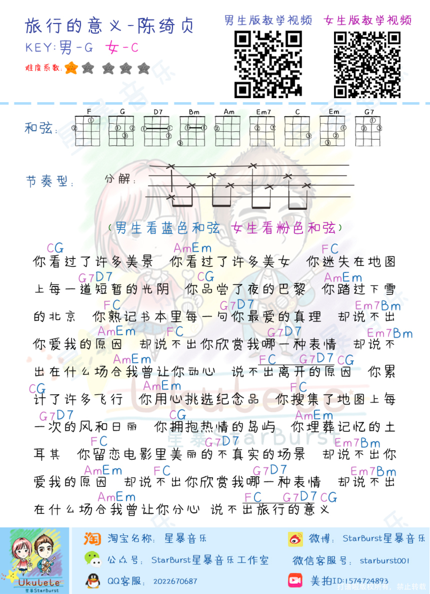 曲谱介绍: 这首曲子是在陈绮贞一次骑机车出去游玩的时候,突然萌生出的旋律,创作该曲时,陈绮贞还没有去过很多地方,她一直向往去各地的旅行,写这首歌时,她是带着一种憧憬的心情写的。但那时候陈绮贞只是一个知名度不高的民谣歌手,没有足够的资源和经济能力,只能用简单木吉他伴奏清唱该曲并以单曲专辑的形式发行了。2005年,陈绮贞在发行专辑《华丽的冒险》时决定给该曲以“速度感”,才把该曲做成她最初想要的样子。 下面跟着小丁和阿ben老师一起学习下这首歌吧【女生版】 男声版尤克里里教学 尤克里里谱