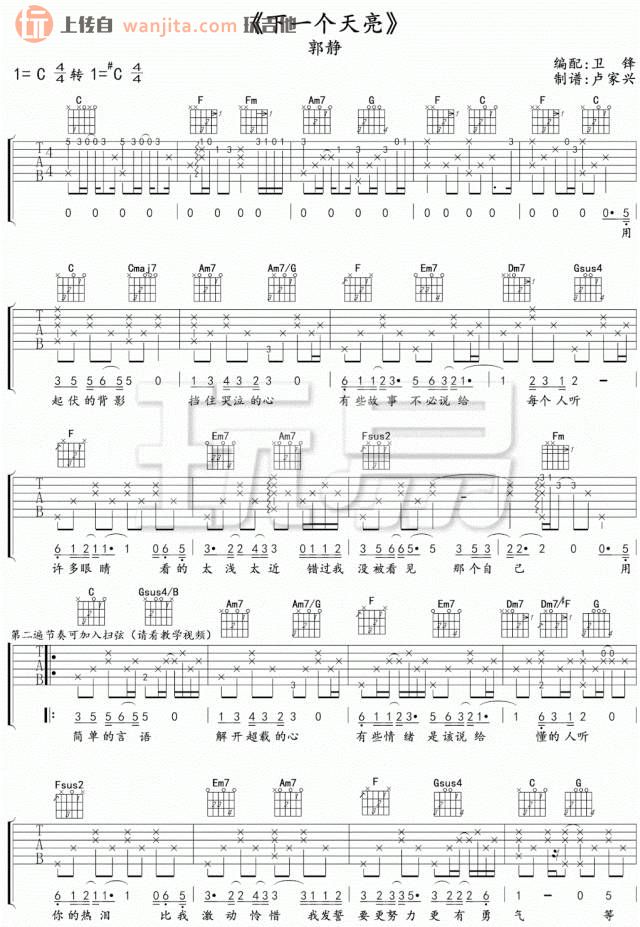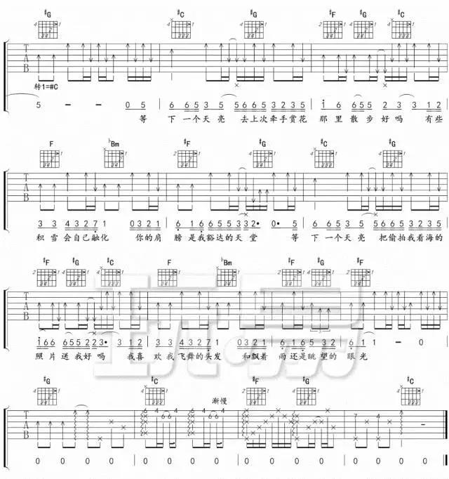 曲谱介绍: 《下一个天亮》这首曲谱,原调C调转#C,不使用变调夹。整首歌曲的弹唱难度一般,不算简单,不适合新手练习,练习的时候需要注意歌曲的层次感和左手和弦的变换。总共2张高清图片谱例,由卢家兴制谱分享。