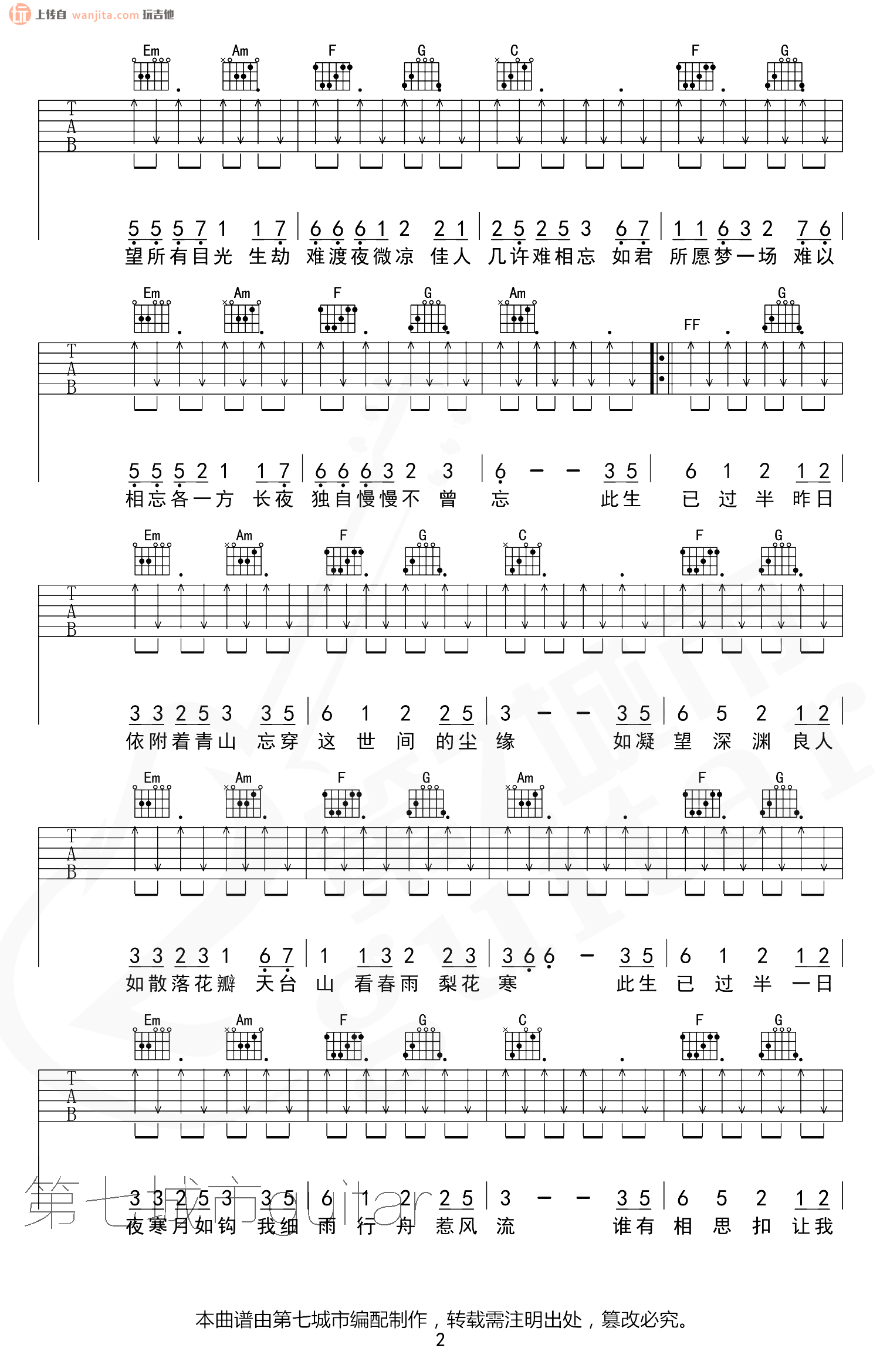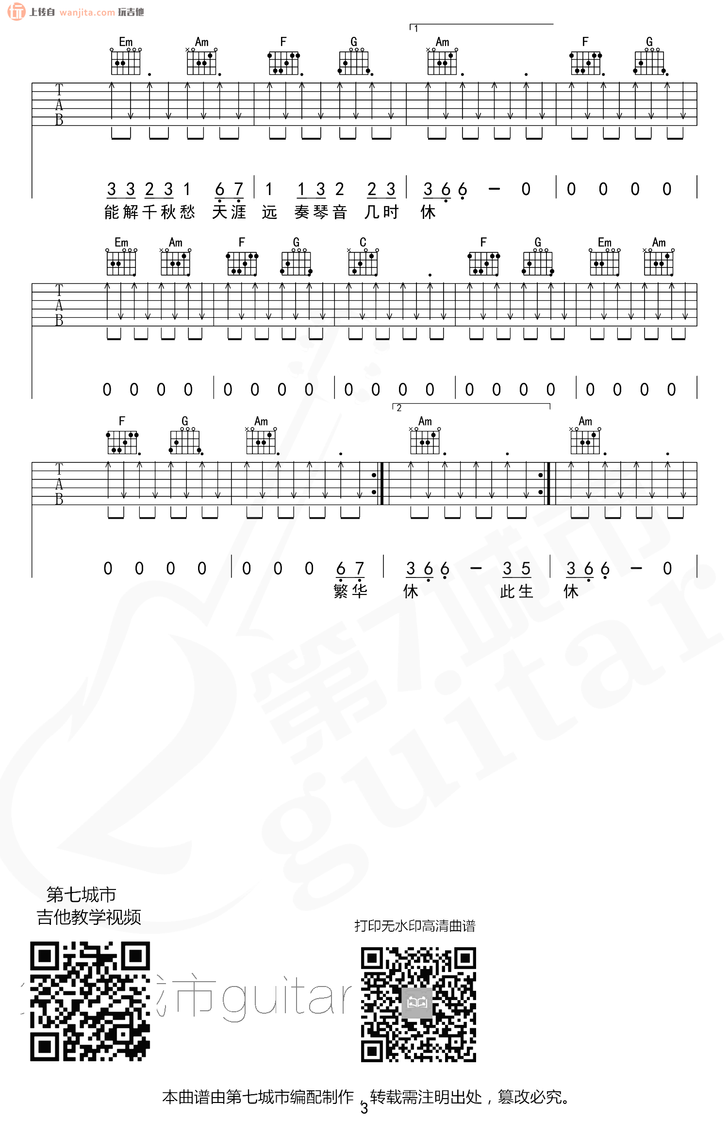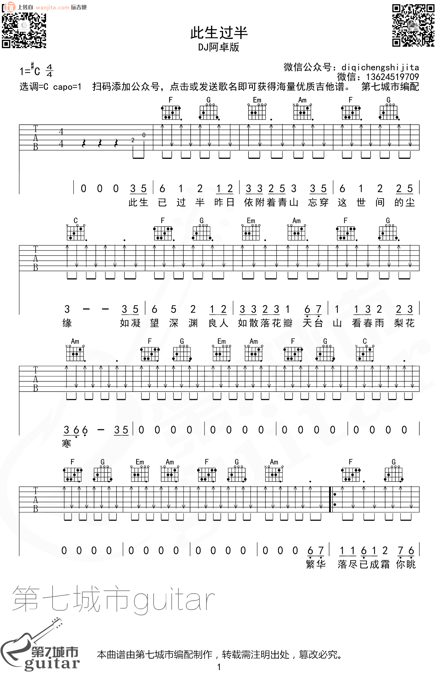 曲谱介绍: 《此生过半》C调吉他弹唱谱,总共3张高清图片谱,原调是#C,选用C调指法,变调夹CAPO夹1品处,曲谱以扫弦节奏,主要的节奏型—切音技巧在扫弦中会有结合的使用,和弦并不复杂,主要还是在右手节奏型的把握,感兴趣的朋友可以先试听上方的音频配合练习。