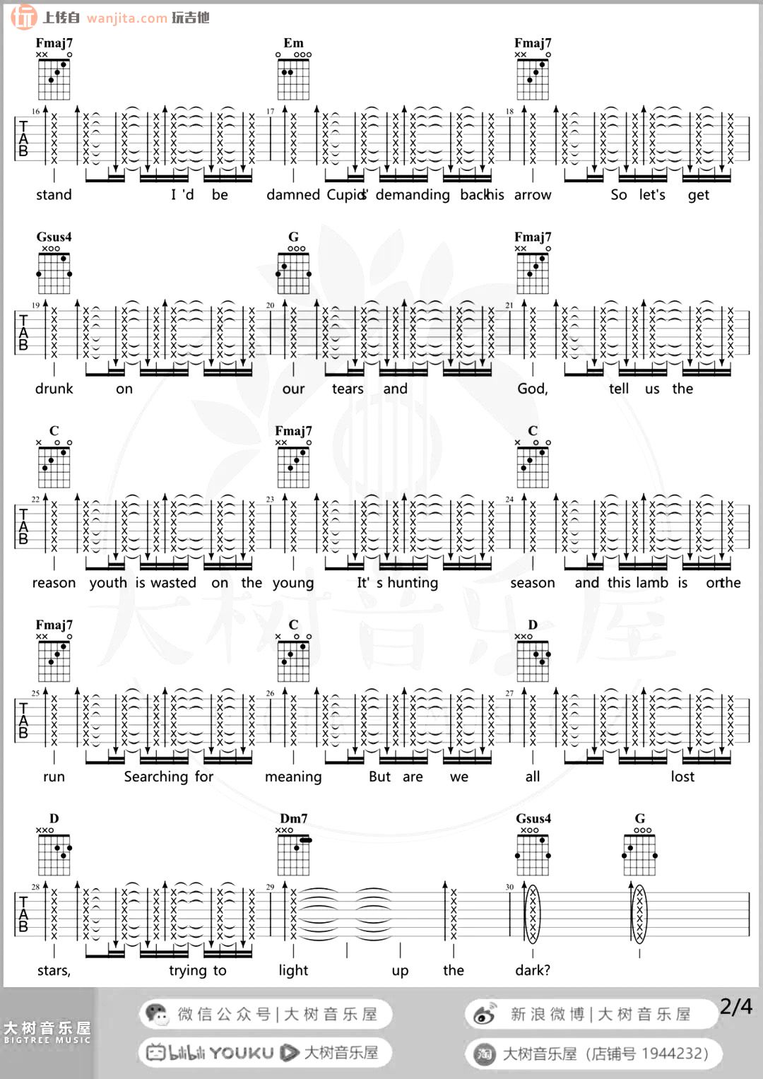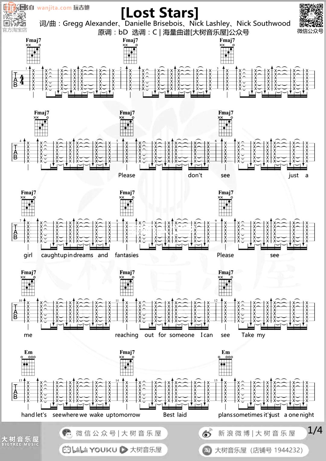 曲谱介绍: 《Lost Stars》吉他谱,原调bD,选用C调,不使用变调夹。最基础的和弦让这张曲谱十分容易学习,推荐新手学习这首深情的民谣歌曲,吉他弹唱更显民谣风格。总共4张高清图片谱例,由大树音乐屋制谱分享。 《Lost Stars》吉他弹唱演示视频 《Lost Stars》吉他弹唱教学视频