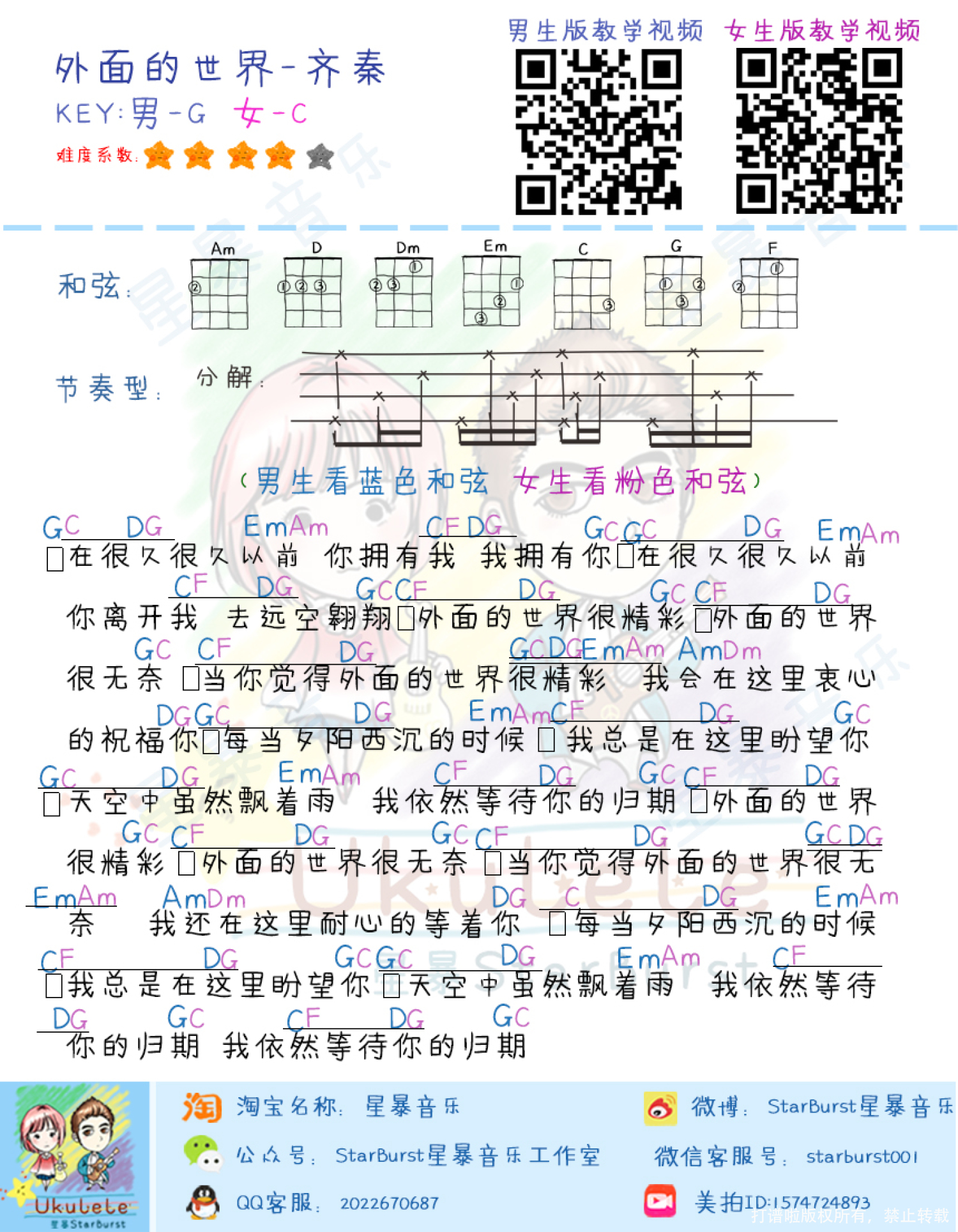 曲谱介绍: 《外面的世界》是一首莫文蔚翻唱齐秦的歌曲,该首歌曲发行于2009年12月22日,出自于其专辑《回蔚》。也是莫文蔚出演电影《东成西就2011》的插曲。 《外面的世界》是齐秦在少年感化院中创作的一首歌曲,由齐秦作词、作曲并演唱,该歌曲被收录于齐秦1987年2月18日发行的专辑《冬雨》中。《外面的世界》几乎唱出了所有人的心酸和无奈。齐秦凭借桀骜不驯的浪子形象,从发型、服饰、墨镜无一遗漏的走进了我们的生活,成为了无数热血青年争相效仿的偶像。   一起与我们阿ben和小丁老师学习这首歌吧[女生版]   男生版尤克里里教学   尤克里里谱