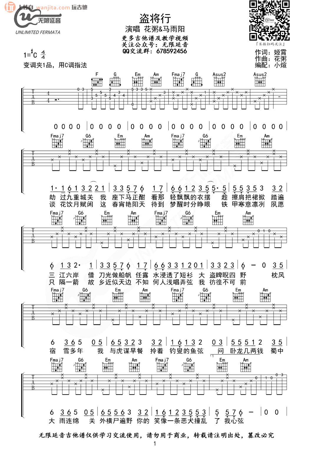 盗将行吉他谱 - 花粥 - C调吉他弹唱谱 - 原版