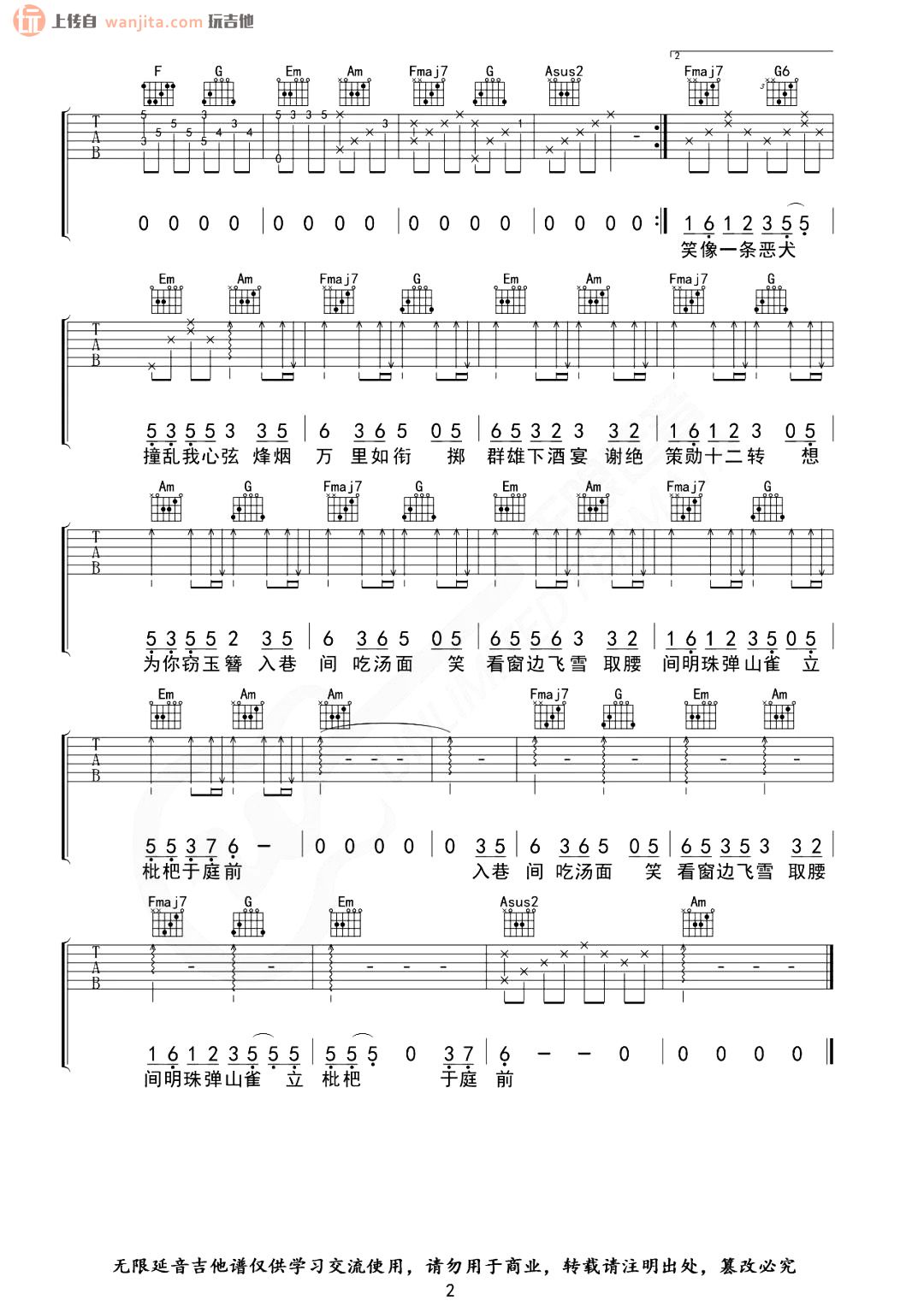 曲谱介绍: 盗将行C调六线谱,原调#C,变调夹夹1品。比较多的和弦让这首小清新的民谣歌曲略显有难度,不推荐新手练习,适合进阶练习,练习的时候需要注意左手和弦的变化。总共2张高清图片谱例,由小煊编配分享。
