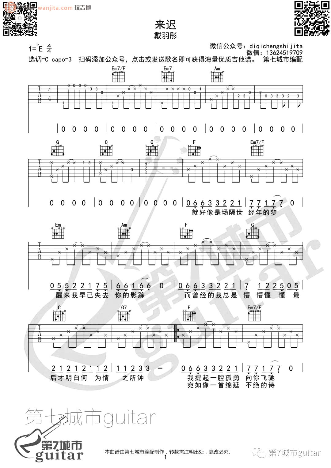 曲谱介绍: 戴羽彤《来迟》吉他弹唱谱,采用C调指法编配,共有3张高清图谱。