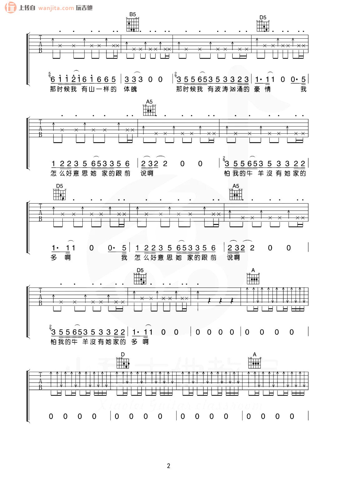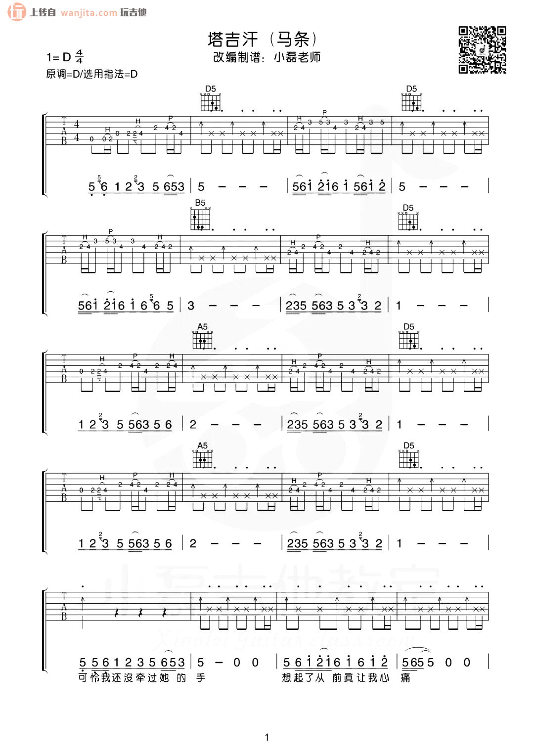 曲谱介绍: 曲谱介绍 《塔吉汗》吉他弹唱谱,原调D调,选用D调指法,不使用变调夹。整首歌曲通过吉他的演绎更为贴合歌词意境,非常适合吉他弹唱的一首歌曲,曲谱还是有一定的难度,虽然和弦比较容易,练习的时候需要注意前奏用到的一些吉他技巧。总共5张高清图片谱例,由小磊老师改编分享。 《塔吉汗》吉他弹唱示范视频 《塔吉汗》吉他谱图例