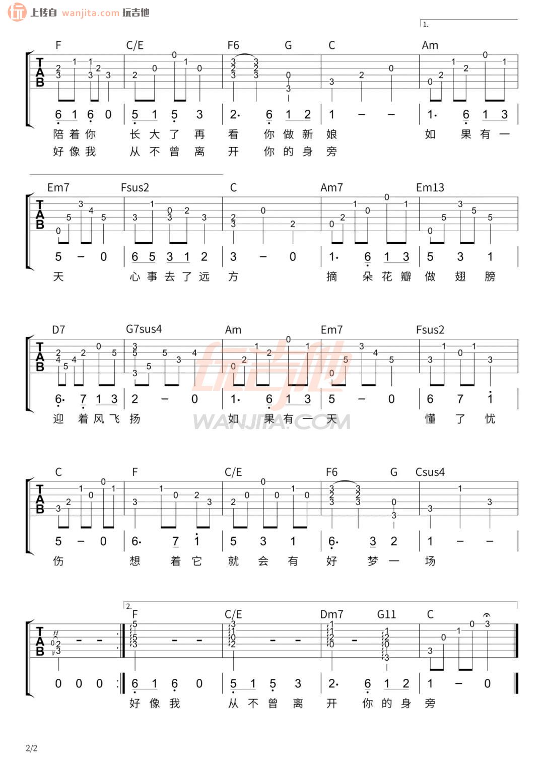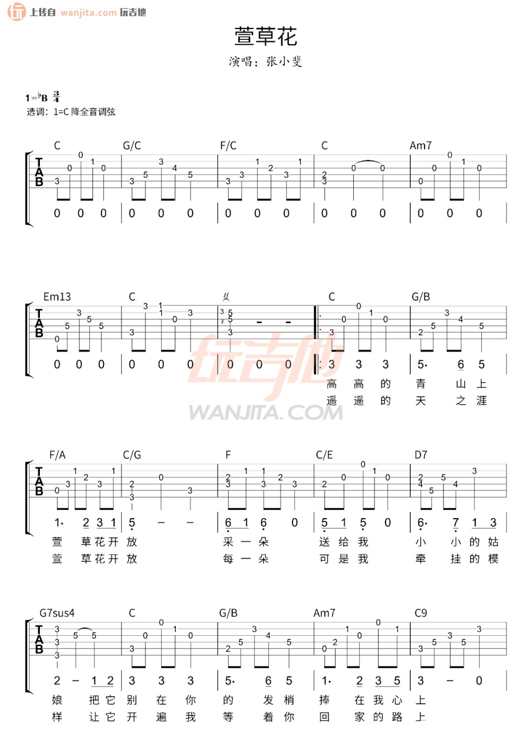 曲谱介绍: 曲谱介绍 这首曲谱,原调是bB,选用C调指法,降全音调弦,弹唱难度不大,总共2张高清图片谱,感兴趣的朋友可以参考这首歌的弹唱演示音频部分,结合练习,弹唱上手难度应该不大,如果这个版本不太喜欢,也可以选择我们另外的其他版本。 萱草花吉他谱图例