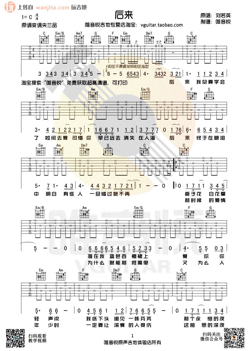曲谱介绍: 刘若英《后来》吉他谱,总共3张高清图片谱,选用C调指法编配,原调是#D,变调夹夹3品可以弹唱原调,曲谱完整度较好,作为这首经典的歌曲,少不了前奏、间奏、尾奏,整首歌曲弹唱出来的还原效果还是非常不错的,感兴趣的朋友可以试听音频,已经录制了间奏及尾奏部分。