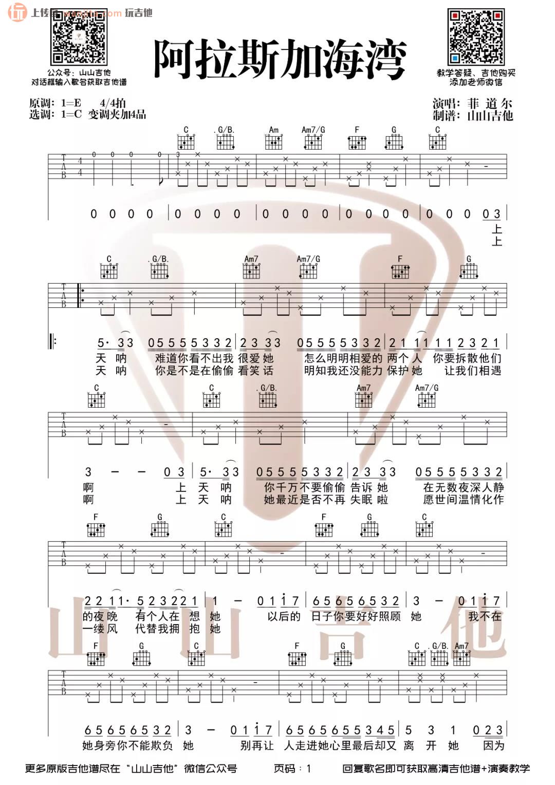 曲谱介绍: 曲谱弹唱技巧 阿拉斯加海湾吉他弹唱谱,选用C调指法编配,由山山吉他制谱,虽然难度不大,但整首曲谱还原度比较高,吉他弹唱非常的好听。整首曲谱包含了完整前奏,分解和弦为主要的节奏型,但一定要把握好节拍的速度,千万不要抢拍,初中级水平的朋友很好上手。